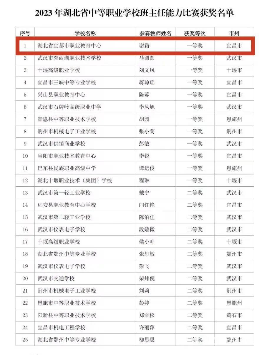 宜都融媒讯(通讯员 吴春佳 安丽丽)近日,由湖北省教育厅主办、湖北省教育科学研究院协办的2023年“中银杯”职业院校教师教学能力大赛和中等职业学校班主任能力大赛,在宜昌市机电工程学校落下帷幕,其中,宜都市职业教育中心教师谢霜荣获班主任能力大赛一等奖第一名,杨梅、谢凤玲、谢霜团队获教学能力大赛思想政治课程组二等奖。