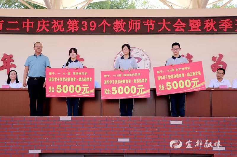 会上宣读了《宜都市二中第39个教师节庆祝大会暨秋季开学典礼表彰通报》,并对荣获2023年宜昌市“师德标兵”、宜都市教育系统“立德崇教 礼致五美”最美教师、第五届清华学子张学政教育奖“杰出育人奖”“励志勤学奖”,第十二届荆南教育园丁奖的10名优秀学生代表和30名优秀老师代表进行表彰,共发放表彰奖金70000元。(通讯员郑守静、李金林)