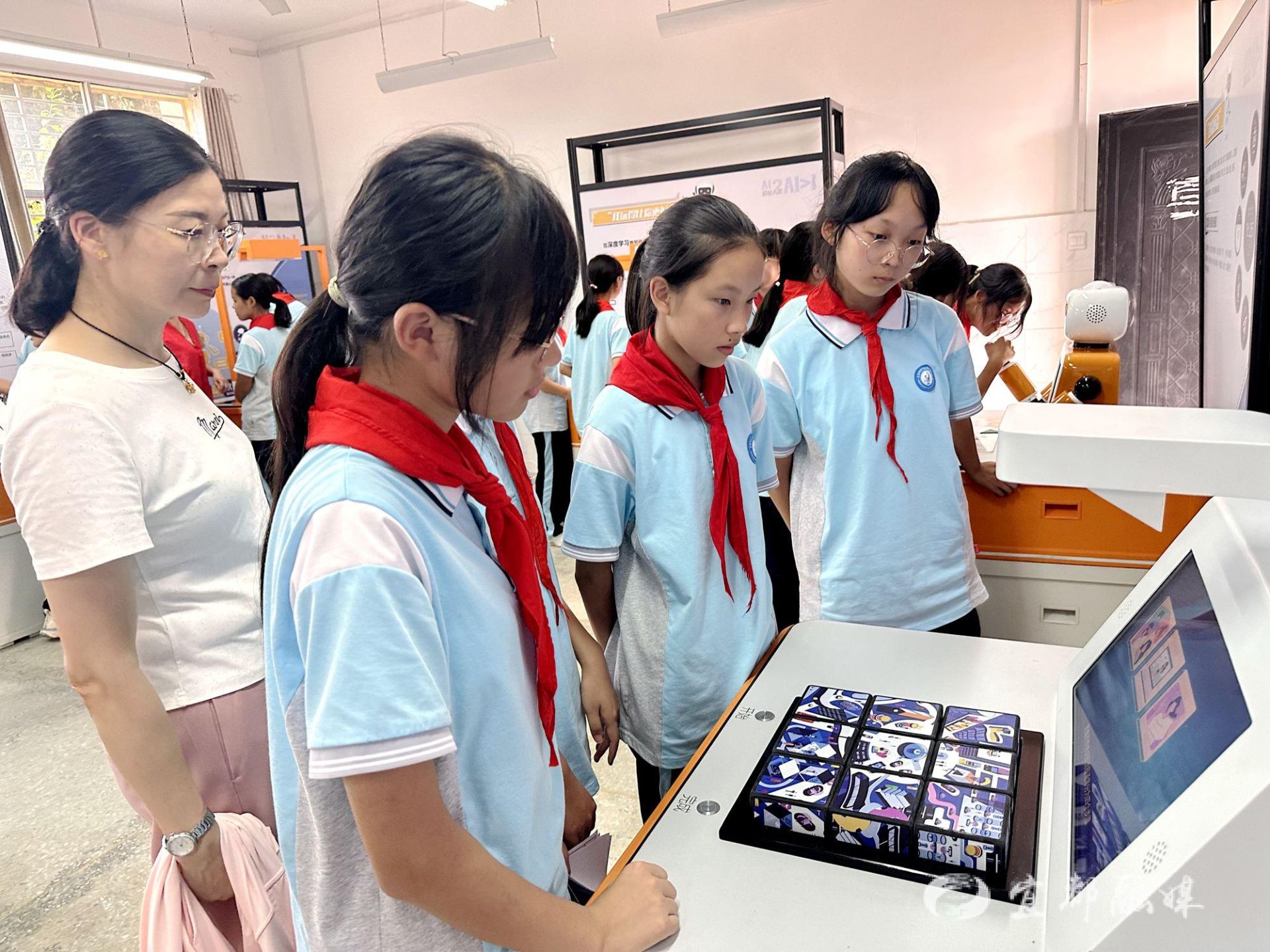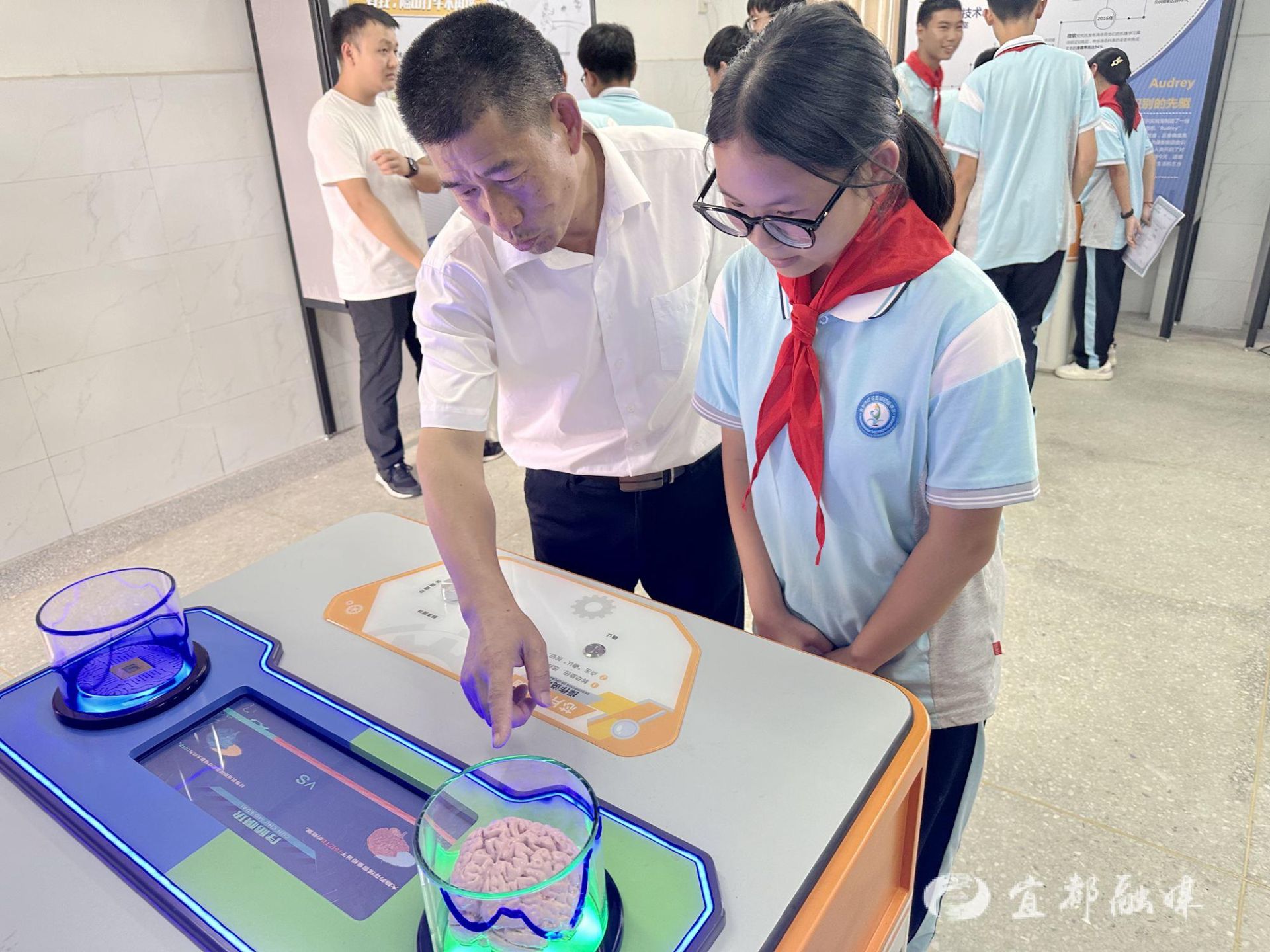 为让孩子们有了近距离品味科普大餐,感受科技魅力的机会,宜都市科协将一系列力学、光学、声学、天文学、数学、音乐、美术等科技模型和科普设备共9件作品送入校园展出,为孩子们呈现了一场集科学性、趣味性、参与性为一体的科普盛宴。同学们争先恐后地观看了解展品的原理,并动手实践操作,亲身体会科技的神奇魅力。