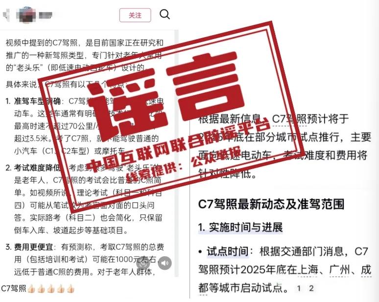 详情:近日,网上流传关于上海、广州、成都等地试点“C7驾照”用于“老头乐”(四轮低速电动车)的消息,声称“2026年初将全国推广C7驾照,届时‘老头乐’需持证上路”“C7 驾照考试极为简单”,甚至编造“C7驾照科目一考口试”等考试细节。据中央广播电视总台中国之声《新闻晚高峰》报道,相关城市公安交管部门予以明确否认,所谓“上海、广州等地试点‘老头乐’C7驾照”不实。相关信息多由四轮低速电动车行业的营销号发布,目前没有设立“C7驾照”,C类驾驶证仅涵盖C1-C6车型,有关营销号发布的内容为虚假宣传。(来源:中央广播电视总台中国之声、央广网)