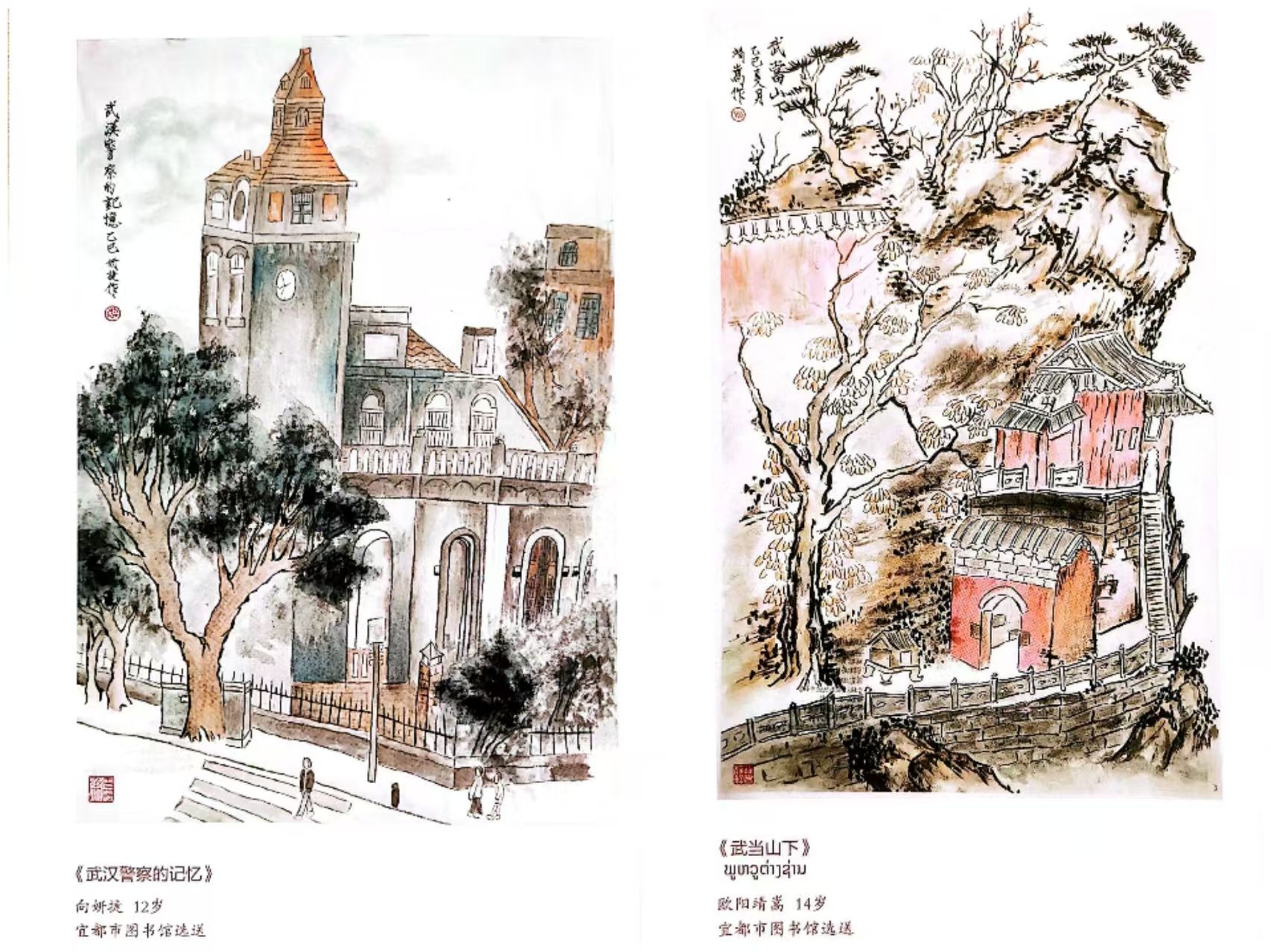 宜都市图书馆在接到画展征稿启事后,第一时间组织全市少年儿童开展创作,经过筛选择优报送40幅画作参与评选。最终,孙一粟的《襄阳名胜古隆中》、向妍婕的《武汉警察的记忆》、欧阳靖嵩的《武当山下》三幅作品成功入展。