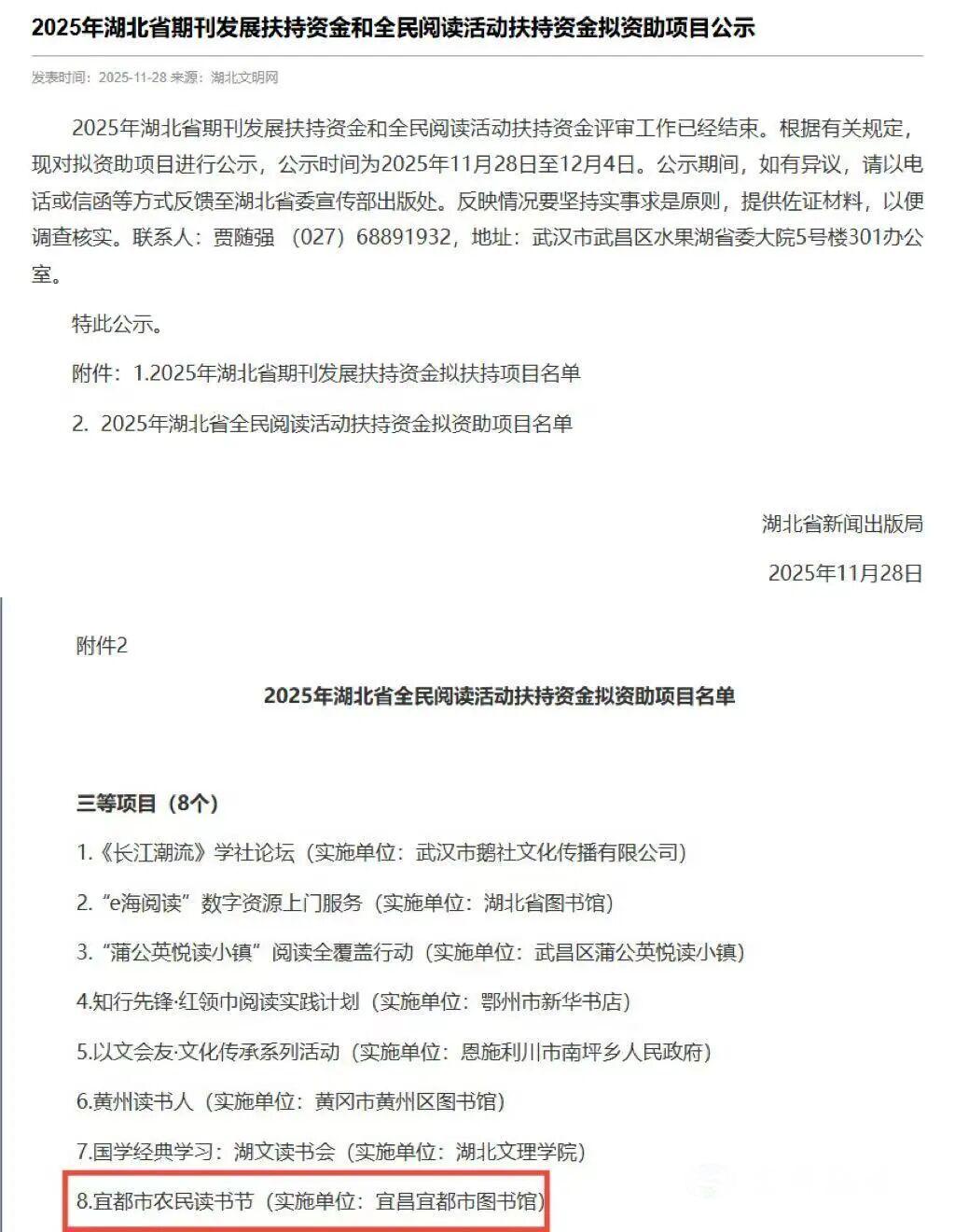 宜都融媒讯 近日,湖北省新闻出版局公布2025年“书香湖北”全民阅读活动扶持资金资助项目名单,宜都市农民读书节获得三等项目扶持。