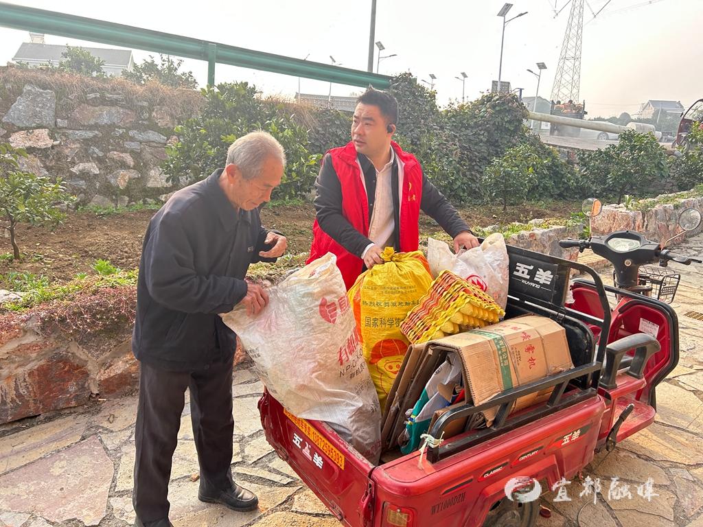 12月11日上午九点,大战坡村的“环保超市”刚刚开门营业,村民们便拎着分类打包好的可回收物品排起了长队。低保户蔡玉清手里的布口袋鼓鼓囊囊,里面装满了塑料瓶、纸壳等可回收废品。经过称重、登记,她成功兑换到了177.2个积分(等同于177.2元现金)。通过“现金+积分”的方式,蔡玉清顺利地换购到了纸巾、碗筷等生活用品。“以前这些废品要么堆在家里占地方,要么就随手扔了,特别可惜。现在能换成积分当钱用,还能为村里的环境整治出份力,真是太划算啦!”蔡玉清脸上洋溢着开心的笑容。