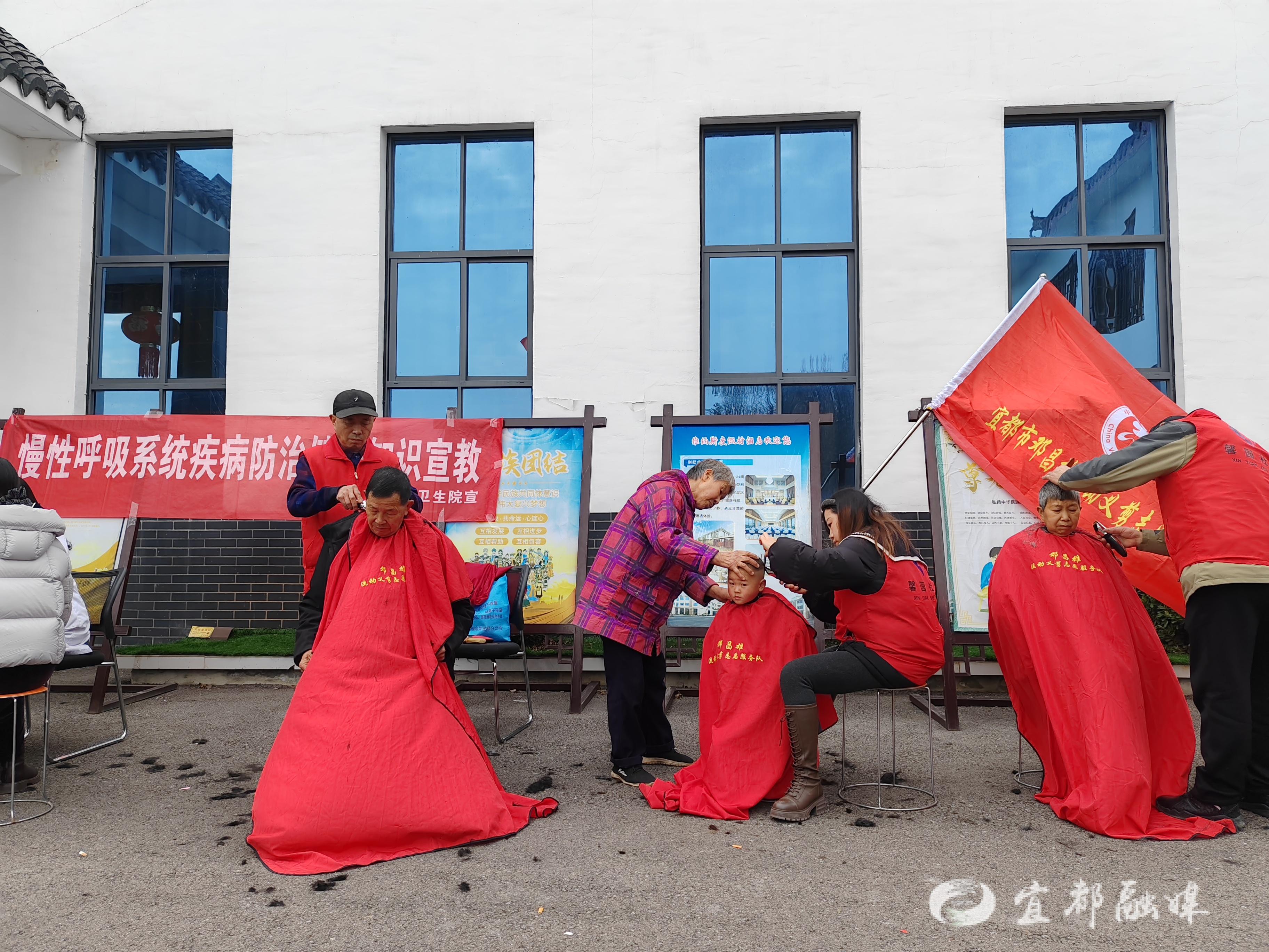 与书写区的书香静雅相映成趣的,是义务理发区那番热闹光景。由“湖北好人”邓昌雄带领的流动义剪队4人正忙得不停。电推剪的“嗡嗡”声与剪刀的“咔嚓”声,合成一支轻快的劳动曲。