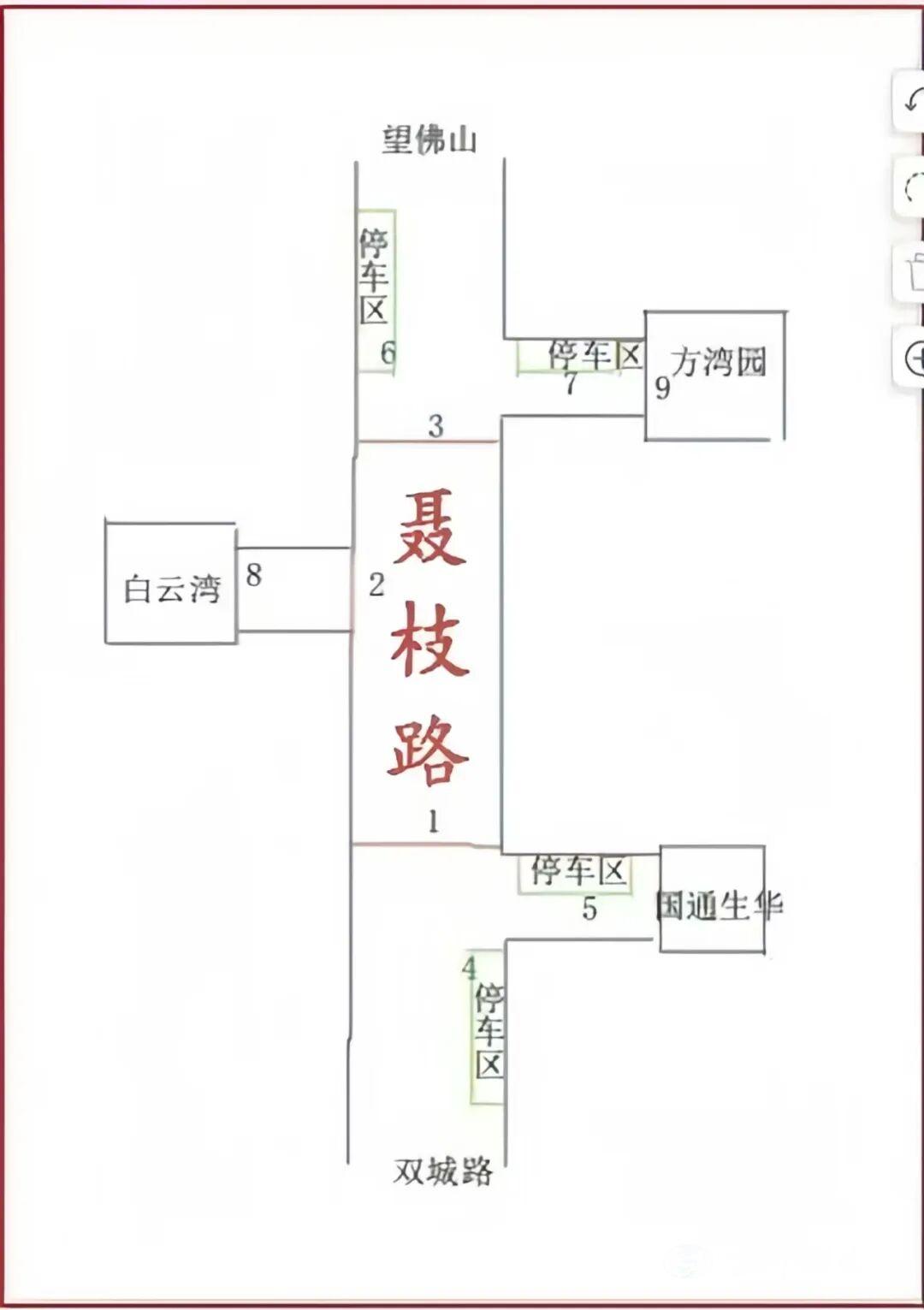 届时,1号(聂枝路国通生华路口)、2号(聂枝路白云湾入口)、3号(聂枝路方湾园入口)将限时封闭,所有车辆请停放在图中所示4、5、6、7号停车区,统一乘坐接驳车至白云湾、方湾园公墓祭扫。