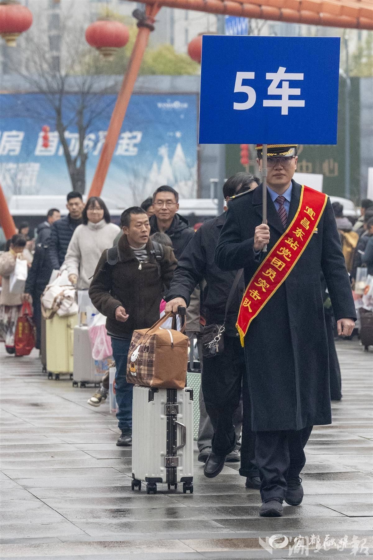 图为工作人员带领外出务工人员有序乘车。湖北日报全媒记者夏晓君摄