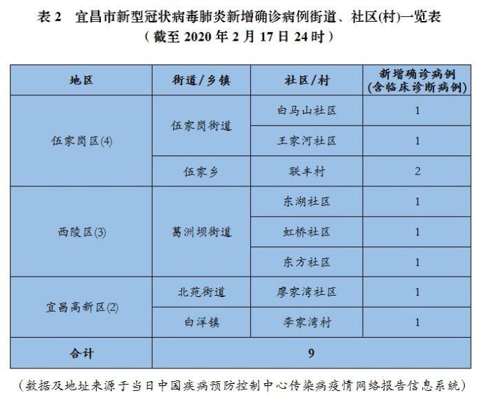 2020年2月17日0-24时,宜昌市报告新型冠状病毒肺炎新增确诊病例9例(含临床诊断病例4例)。其中:伍家岗区4例、西陵区3例、宜昌高新区2例,点军区、猇亭区、夷陵区、宜都市、枝江市、当阳市、远安县、秭归县、兴山县、长阳土家族自治县、五峰土家族自治县均无新增确诊病例。新增治愈出院30例(西陵区14例、长阳土家族自治县4例、猇亭区3例、当阳市3例、伍家岗区2例、点军区2例、夷陵区1例、兴山县1例)。无新增死亡病例。