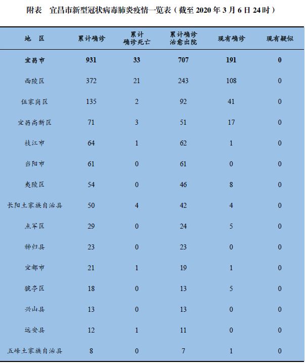 截至3月6日24时,累计报告确诊病例931例,其中西陵区372例、伍家岗区135例、宜昌高新区71例、枝江市64例、当阳市61例、夷陵区54例、长阳土家族自治县50例、点军区29例、秭归县23例、宜都市21例、猇亭区18例、兴山县13例、远安县12例、五峰土家族自治县8例。