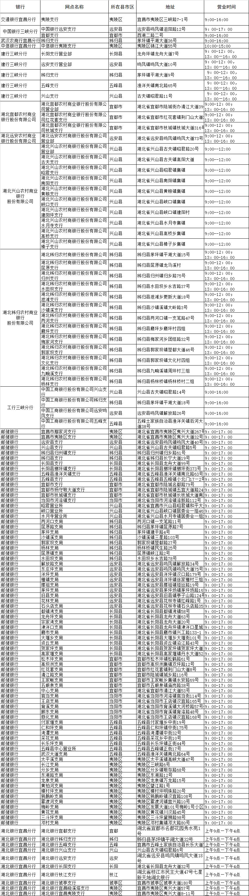 目前,中国银行、工行、建行、交通银行、中信银行、湖北银行、武汉农商行、邮储银行、宜都农商行、远安农商行、兴山农商行、秭归农商行的部分营业网点已通过审批,明日开始正常营业,营业时间不尽相同(见《3月16日银行业金融机构对外营业网点统计》)。各行的线上渠道及自助银行机具设备均已正常运行。