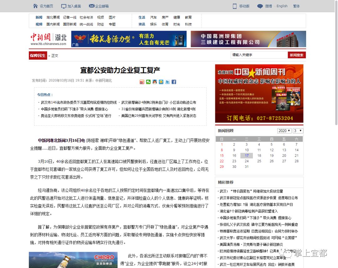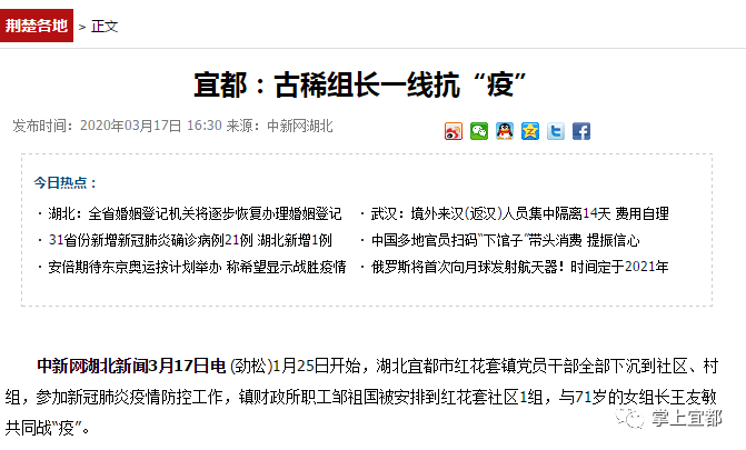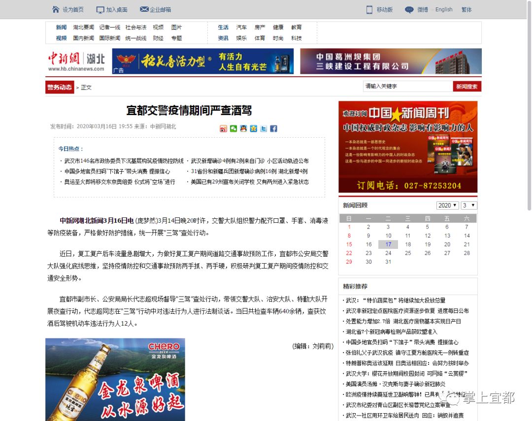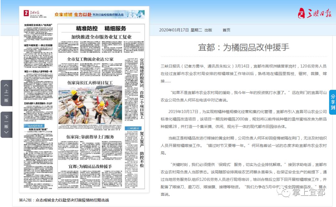 3月17日),上级主流媒体刊发我市抗疫工作新闻稿件25条,累计刊发691条。《湖北宜都:春色美 春耕忙》《宜都:为柑橘品改伸援手》《宜都交警疫情期间严查酒驾》《宜都:防疫施工“两手抓”,脱贫攻坚“电加速”》《宜都首趟返岗复工专车今日启程前往上海》等新闻稿件在湖北日报客户端、中新网、三峡日报等媒体推介。