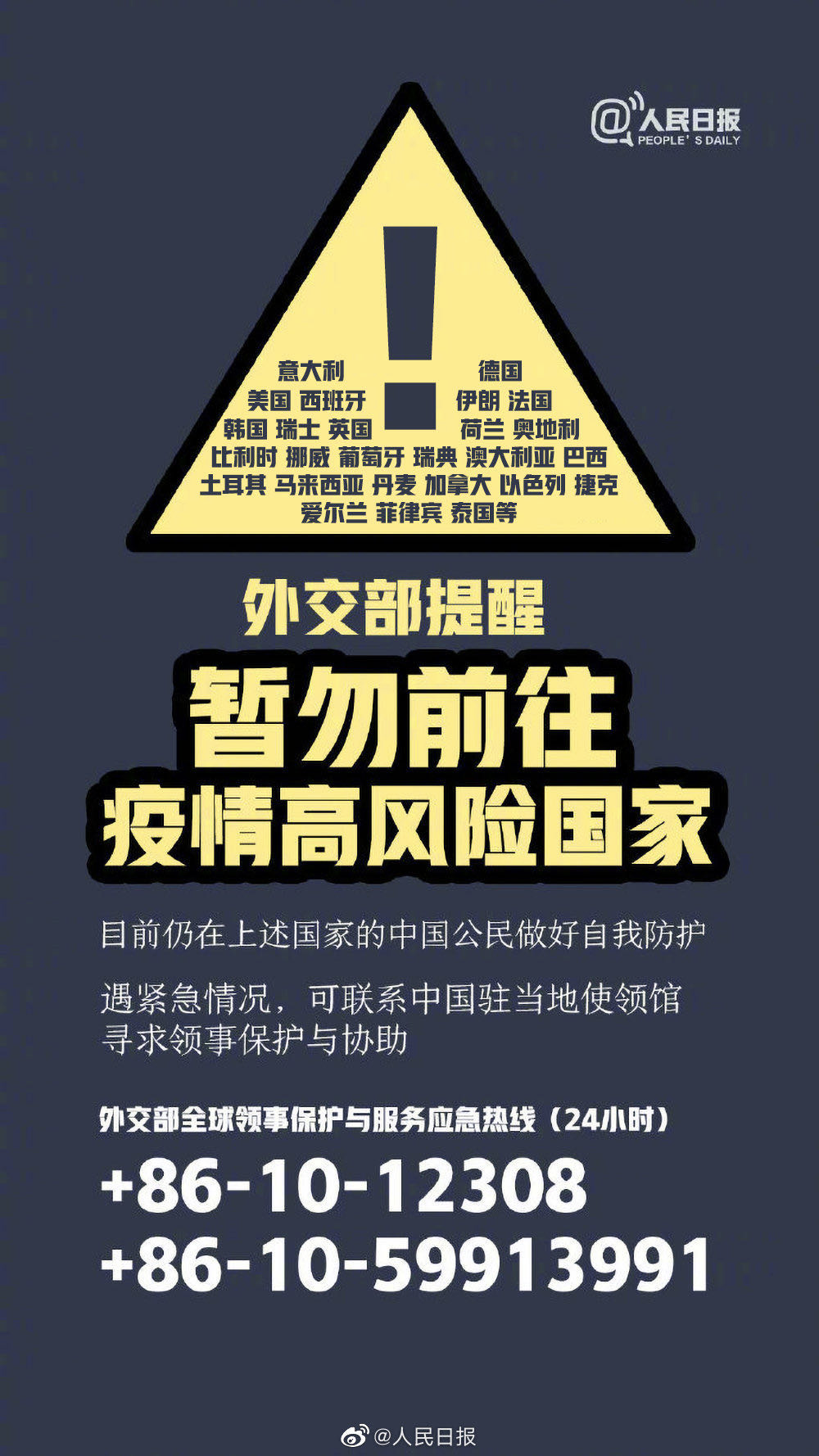 4月2日,外交部新公布11个疫情高风险国家,郑重提醒中国公民暂勿前往意大利、美国、西班牙、德国、伊朗、法国、韩国、瑞士、英国、荷兰、奥地利、比利时、挪威、葡萄牙、瑞典、澳大利亚、巴西、土耳其、马来西亚、丹麦、加拿大、以色列、捷克、爱尔兰、菲律宾、泰国等高风险国家。