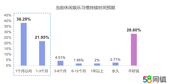 展望疫情过后的下沉市场,报告显示,60.24%的用户认为休闲娱乐习惯在3个月内可以恢复至平时状态。疫情结束后,用户最想做的事情是工作赚钱,占比达到48.43%,其次是陪伴家人、旅游、体育锻炼和下馆子等。疫情期间被压抑的消费需求会在疫情结束后逐渐释放,外出就餐、本地游、健身、购房买车等或将快速回暖并获得较大发展空间,乡镇用户可通过58同镇满足各种生活服务消费场景需求。