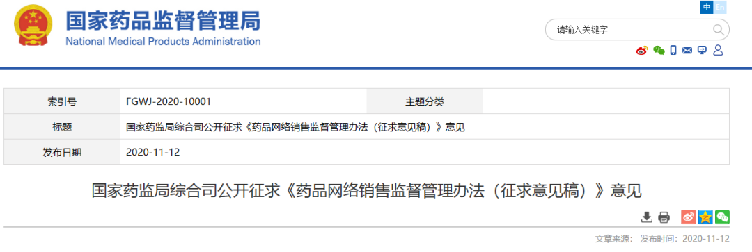 11月12日,国家药品监督管理局发布新修改的《药品网络销售监督管理办法(征求意见稿)》,就规范药品网络销售行为再次公开征求意见。