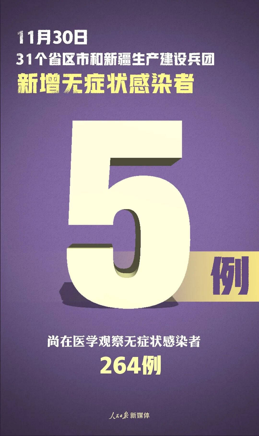 31个省(自治区、直辖市)和新疆生产建设兵团报告新增无症状感染者5例(境外输入4例);当日转为确诊病例5例(境外输入2例);当日解除医学观察17例(均为境外输入);尚在医学观察无症状感染者264例(境外输入259例)。
