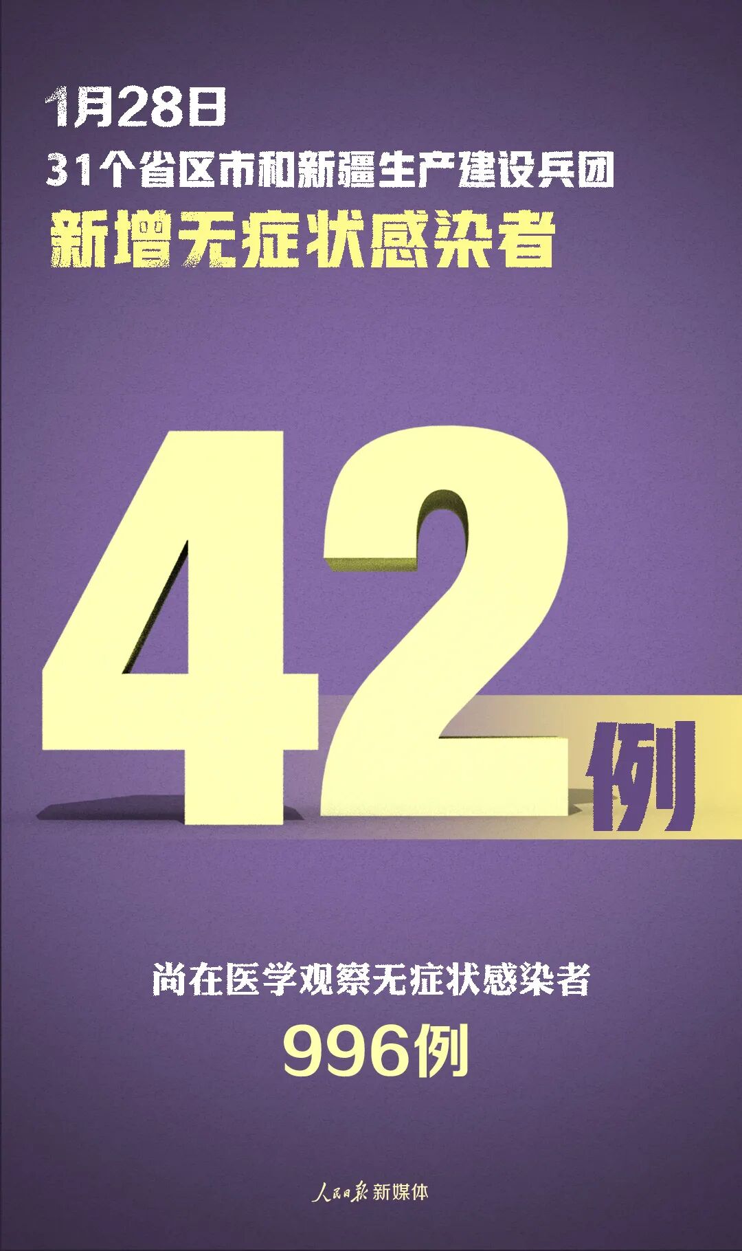 31个省(自治区、直辖市)和新疆生产建设兵团报告新增无症状感染者42例(境外输入19例);当日转为确诊病例12例(境外输入1例);当日解除医学观察22例(境外输入13例);尚在医学观察无症状感染者996例(境外输入293例)。
