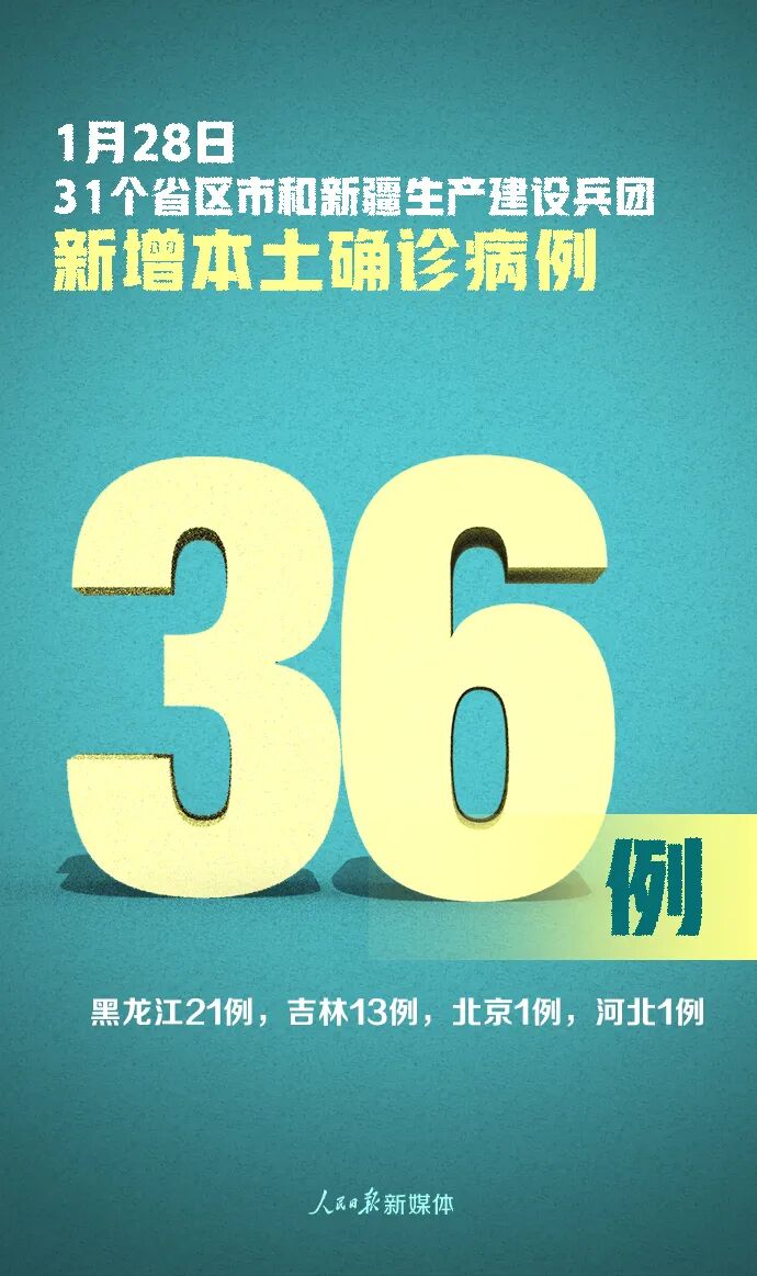 1月28日0—24时,31个省(自治区、直辖市)和新疆生产建设兵团报告新增确诊病例52例,其中境外输入病例16例(上海9例,广东5例,天津1例,湖南1例),本土病例36例(黑龙江21例,吉林13例,北京1例,河北1例);无新增死亡病例;新增疑似病例2例,其中境外输入病例1例(在上海),本土病例1例(在北京)。