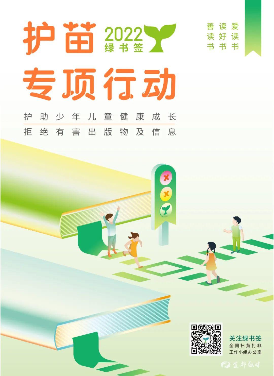 为营造全社会共同关心关爱未成年人健康成长的良好氛围,全国“扫黄打非”办公室决定在“护苗2022”专项行动中,组织开展2022年“绿书签行动”,主题是“护助少年儿童健康成长,拒绝有害出版物及信息”。各地将面向社会广泛开展形式丰富、生动活泼的系列“护苗”宣传教育。4月19日,全国“扫黄打非”办公室对外发布2022年“绿书签行动”宣传海报、书签设计图样。