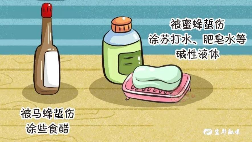 这里要了解是被哪种蜂蜇了。因为胡蜂毒液是弱碱性的,蜜蜂毒液是弱酸性的,酸碱不同,处理方法自然也不同。被胡蜂蜇了,可以往伤口上涂些食醋来缓解疼痛症状,被蜜蜂蜇伤了就要涂苏打水、肥皂水等碱性液体,来缓解疼痛症状。也可以用冰块敷在被蜇的地方,来减轻疼痛和肿胀,实在痛得受不了,吃点止痛药也是可以的。