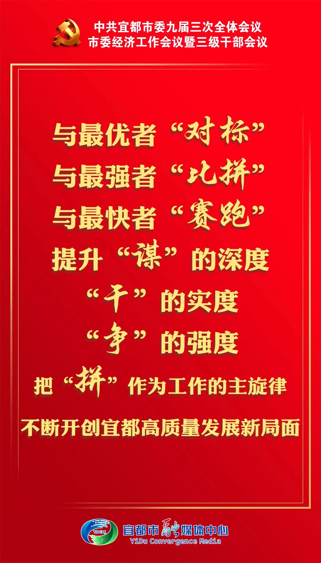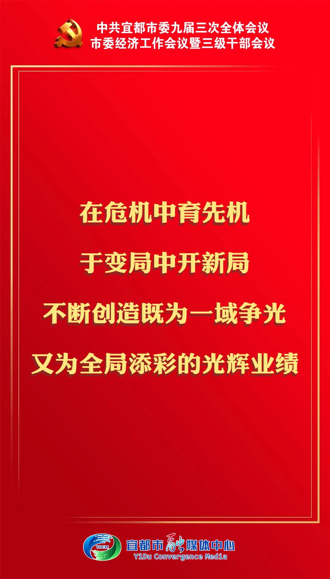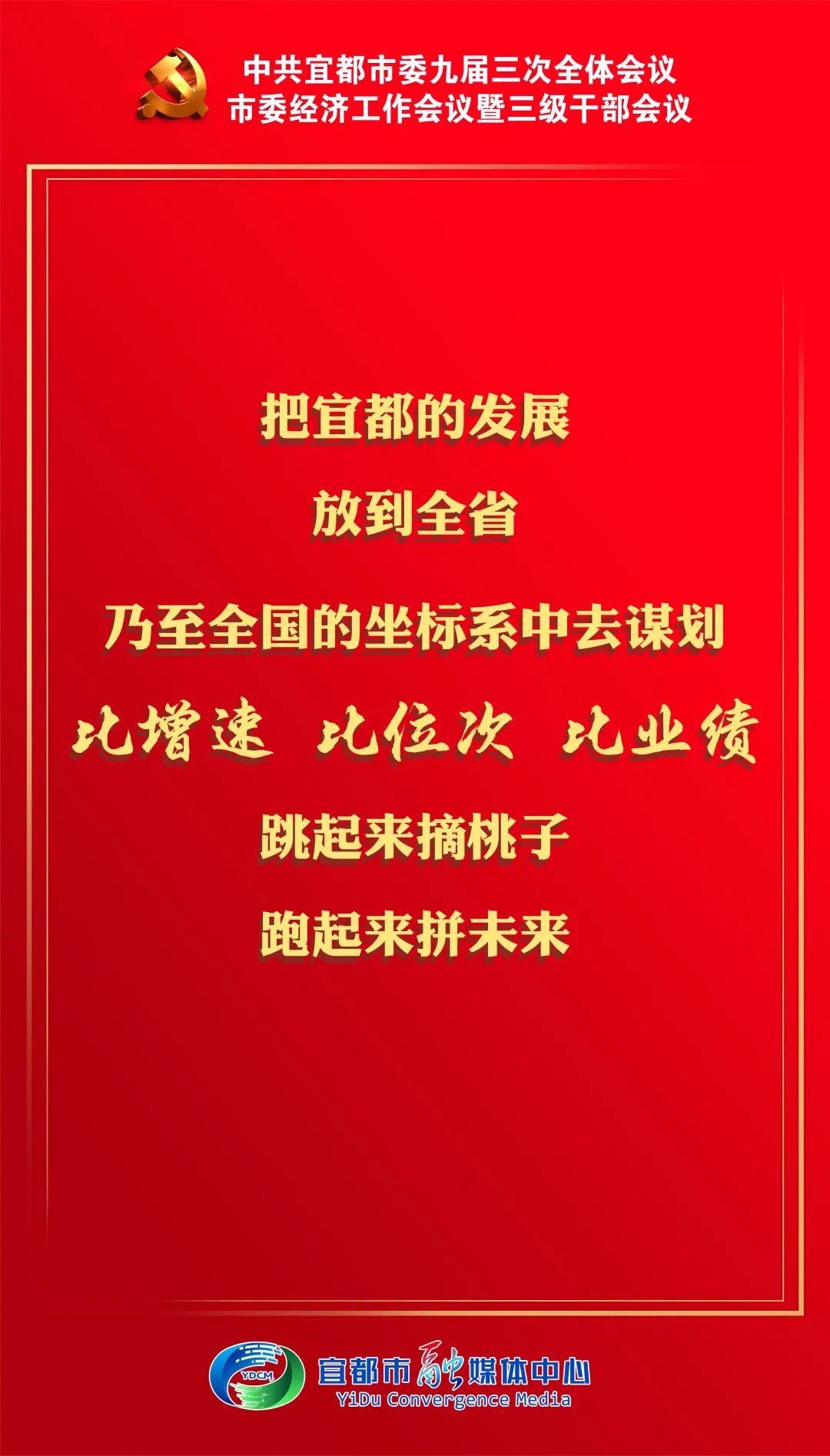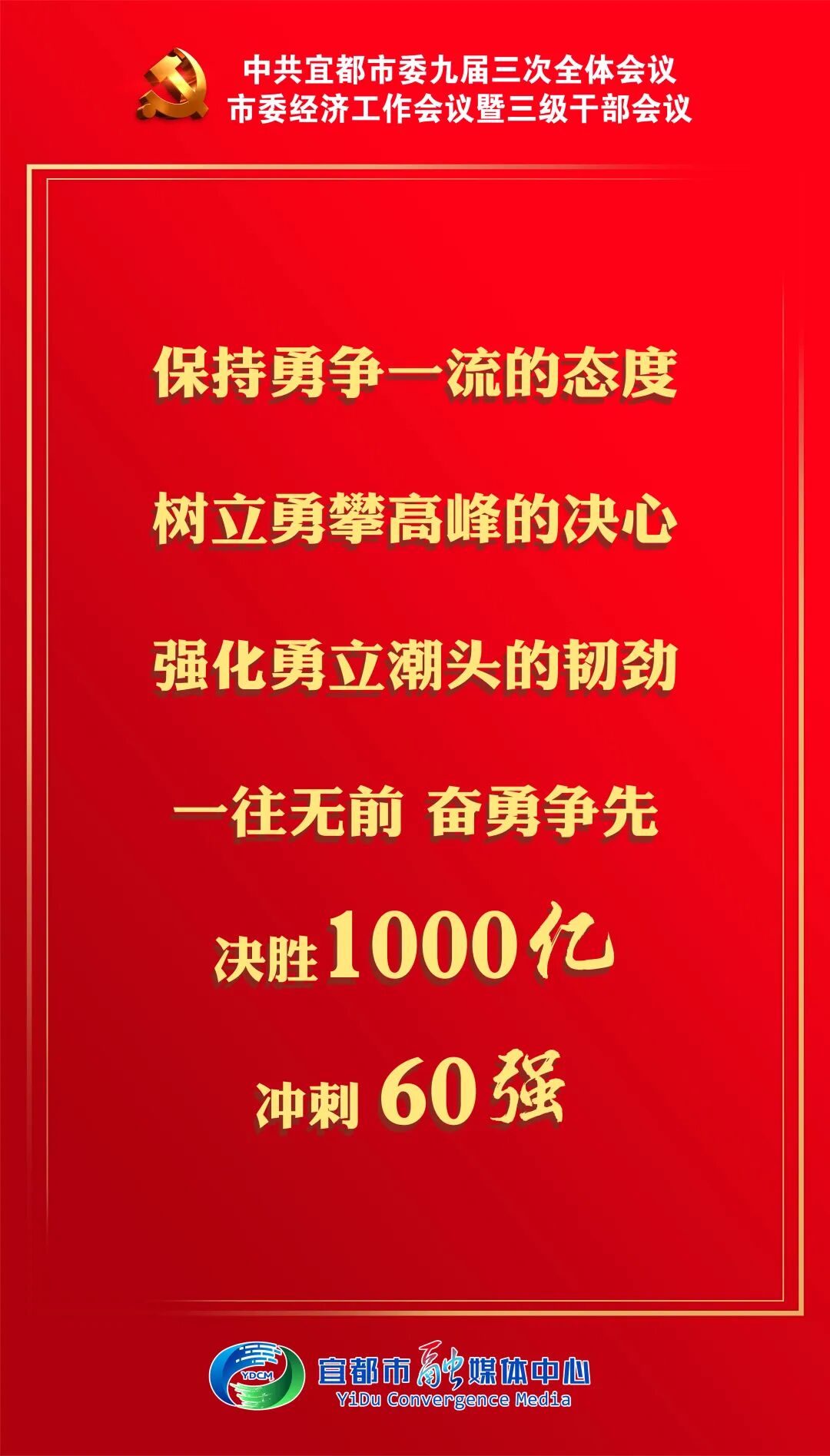 1月28日,市委九届三次全体会议、市委经济工作会议暨三级干部会议在宜都大剧院召开。大会现场金句频频,提振信心,擂响新年奋进鼓!动员全市上下要保持勇争一流的态度,树立勇攀高峰的决心,强化勇立潮头的韧劲,一往无前,奋勇争先,为“决胜1000亿、冲刺60强”、建成宜昌首个千亿县市、建设共富共美现代化新宜都而团结奋斗。