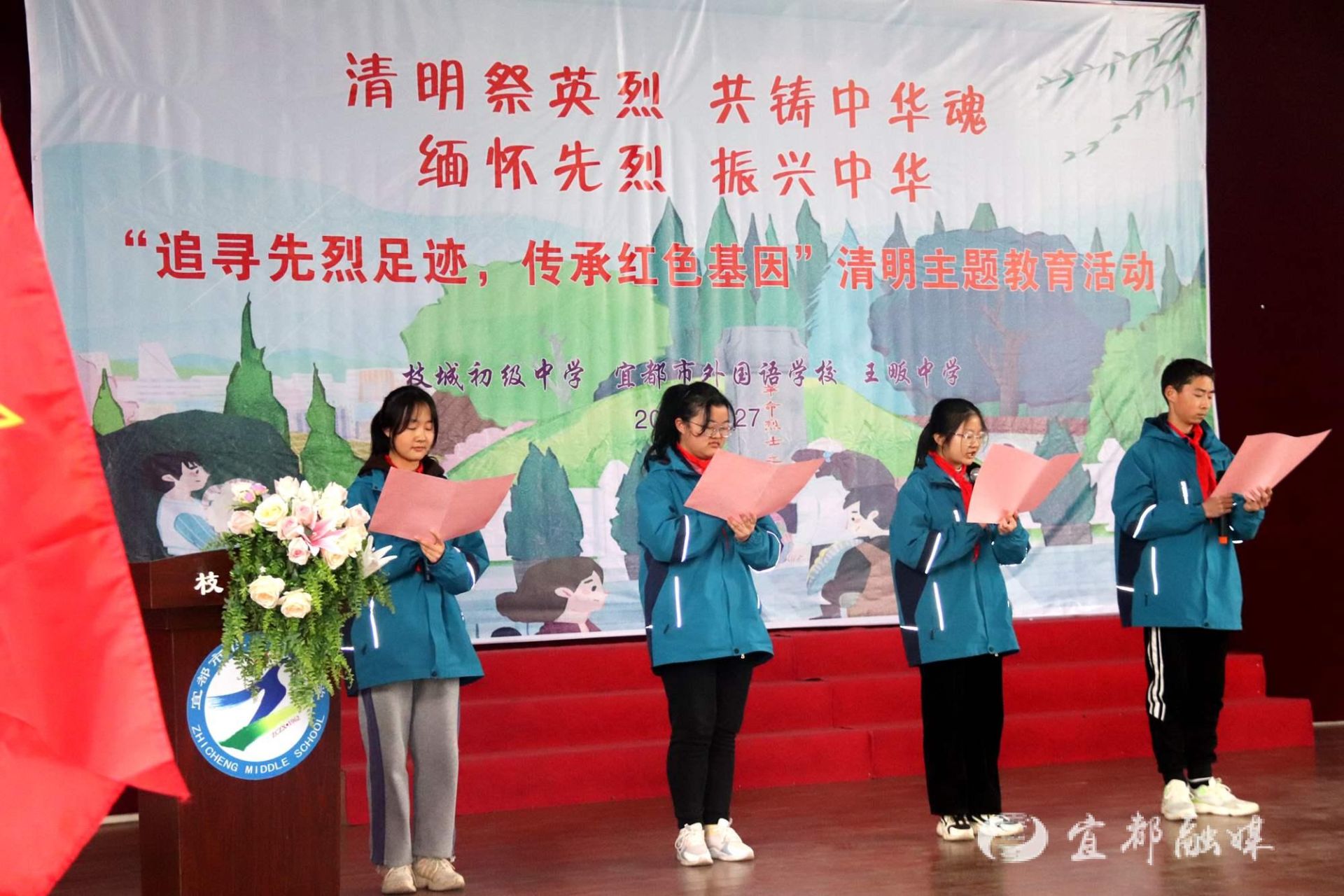 宜都融媒讯(通讯员 廖根深)3月27日,清明将至,共属同一“教联体”的枝城中学、市外国语学校、王畈中学的部分师生齐聚枝城中学校园内的烈士陵园,开展“追寻革命先烈、传承红色基因”清明主题教育活动。枝城镇退役军人服务站也参与了本次活动。