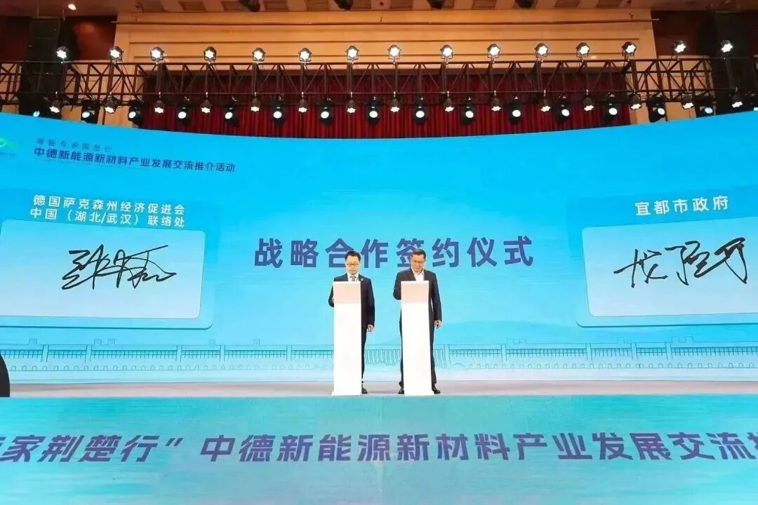3月31日上午,宜昌第二届“330”三峡国际人才日“海智专家荆楚行”中德新能源新材料产业发展交流推介活动启动,活动现场,德国萨克森州经济促进会中国(湖北/武汉)联络处与宜都市人民政府签订战略合作框架协议仪式。根据协议,双方将开展多内容、多层次、多渠道、多形式战略合作,推动投资促进、经贸合作、人才培养、产学研合作、科技成果转化、海外人才创新创业、文化交流平台搭建建设,共同把宜都打造成县域对外开放先行区、经贸交流新样板、人才引育新高地、科技合作示范地。