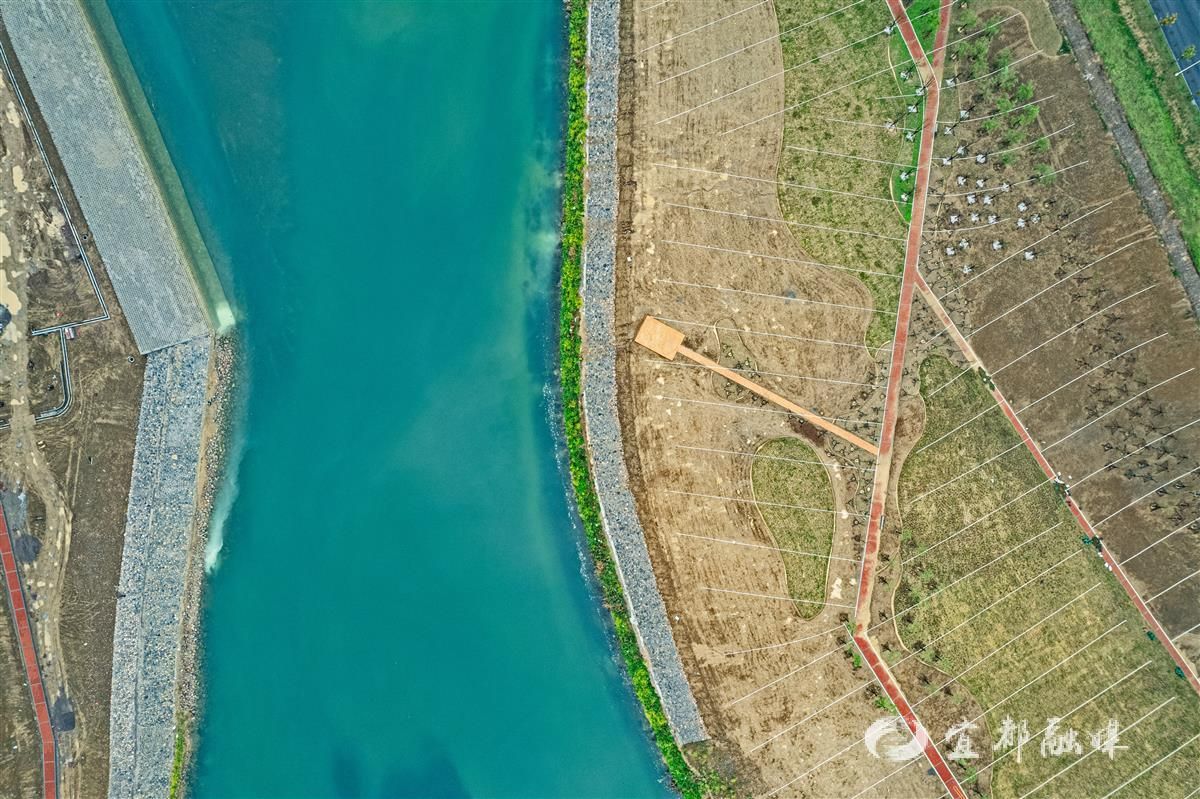 4月3日,一场春雨过后,已初具雏形的宜都渔洋河河口公园露出清新面容,从空中俯瞰,分层次的花草植被呈现出美丽的几何图形,犹如一幅水墨画镶嵌在河岸边,蔚为壮观。