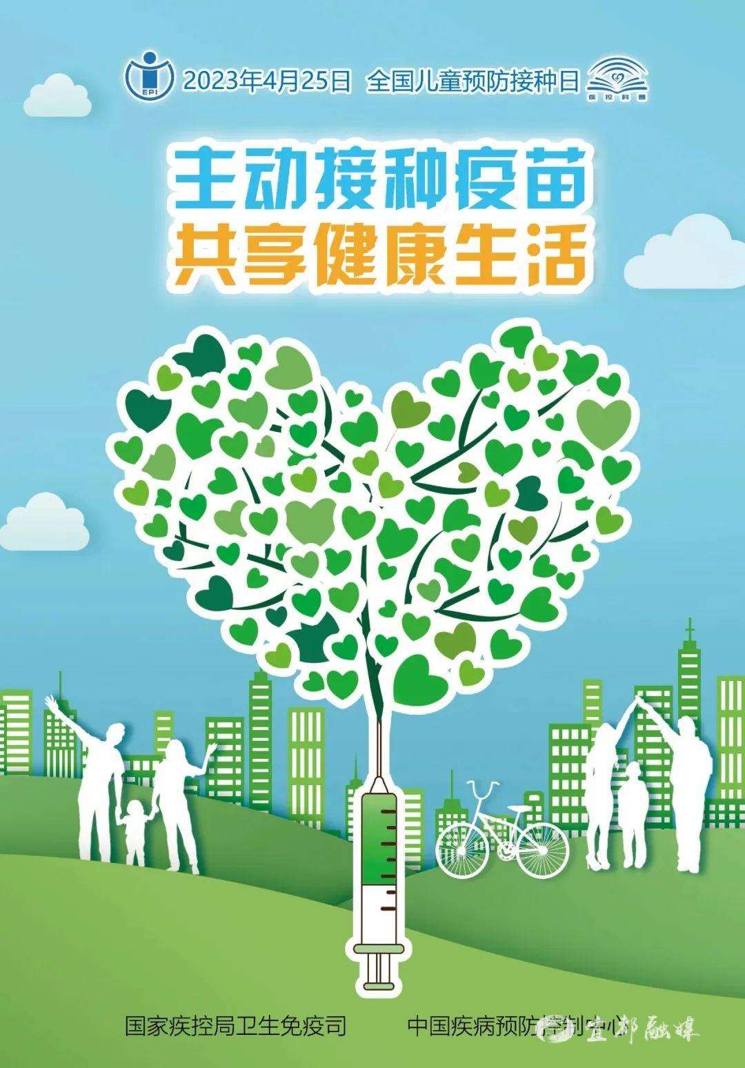 2023年4月25日为我国第37个“全国儿童预防接种日”。为深入贯彻落实新时期以预防为主的卫生与健康工作方针,进一步宣传疫苗接种在控制传染病、保护人民群众生命健康中的重要作用,营造预防接种的良好氛围,倡导全社会重视、关心和支持预防接种工作,国家疾病预防控制局确定2023年“全国儿童预防接种日”的宣传主题为“主动接种疫苗,共享健康生活”。