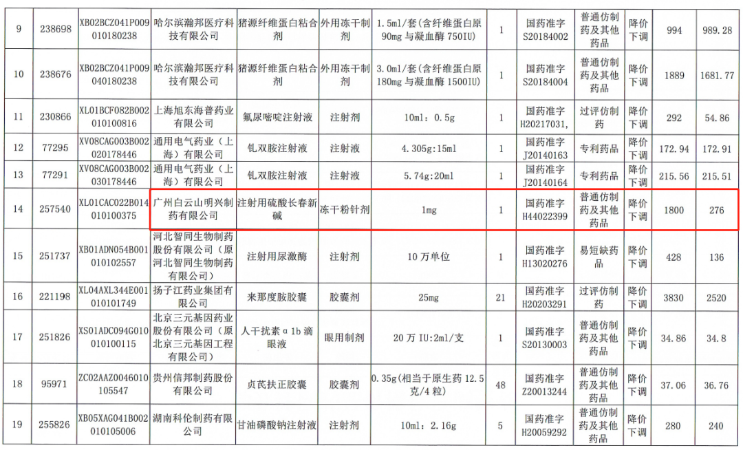 湖北省医疗保障局发布《关于调整部分挂网药品价格信息的通知》。即日起,湖北28个挂网药品价格调整下调价格最多的是广州白云山明兴制药有限公司的注射用硫酸长春新碱,原价1800元/mg,降至276元/mg,下调1524元。