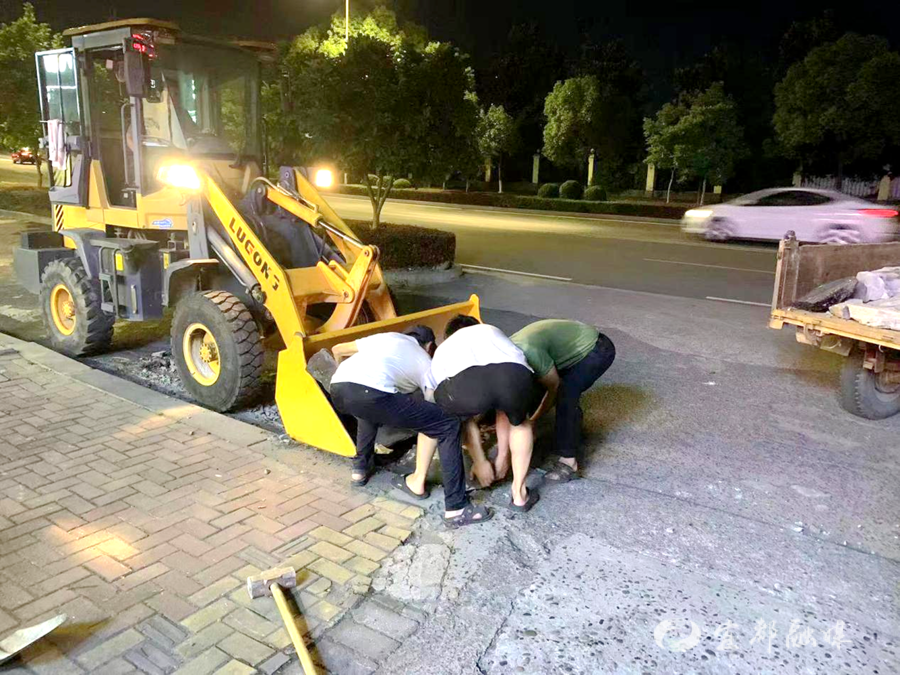 行动中,为进一步提升施工效率,保障市民正常出行需要,中队聘请专业施工队全程跟进,经过精心规划和组织,利用拆除设备和工具,连夜对长江大道延伸段和城乡路延伸段的“私接踏步”进行拆除,并将水泥砖块清理干净,确保道路整洁通畅。