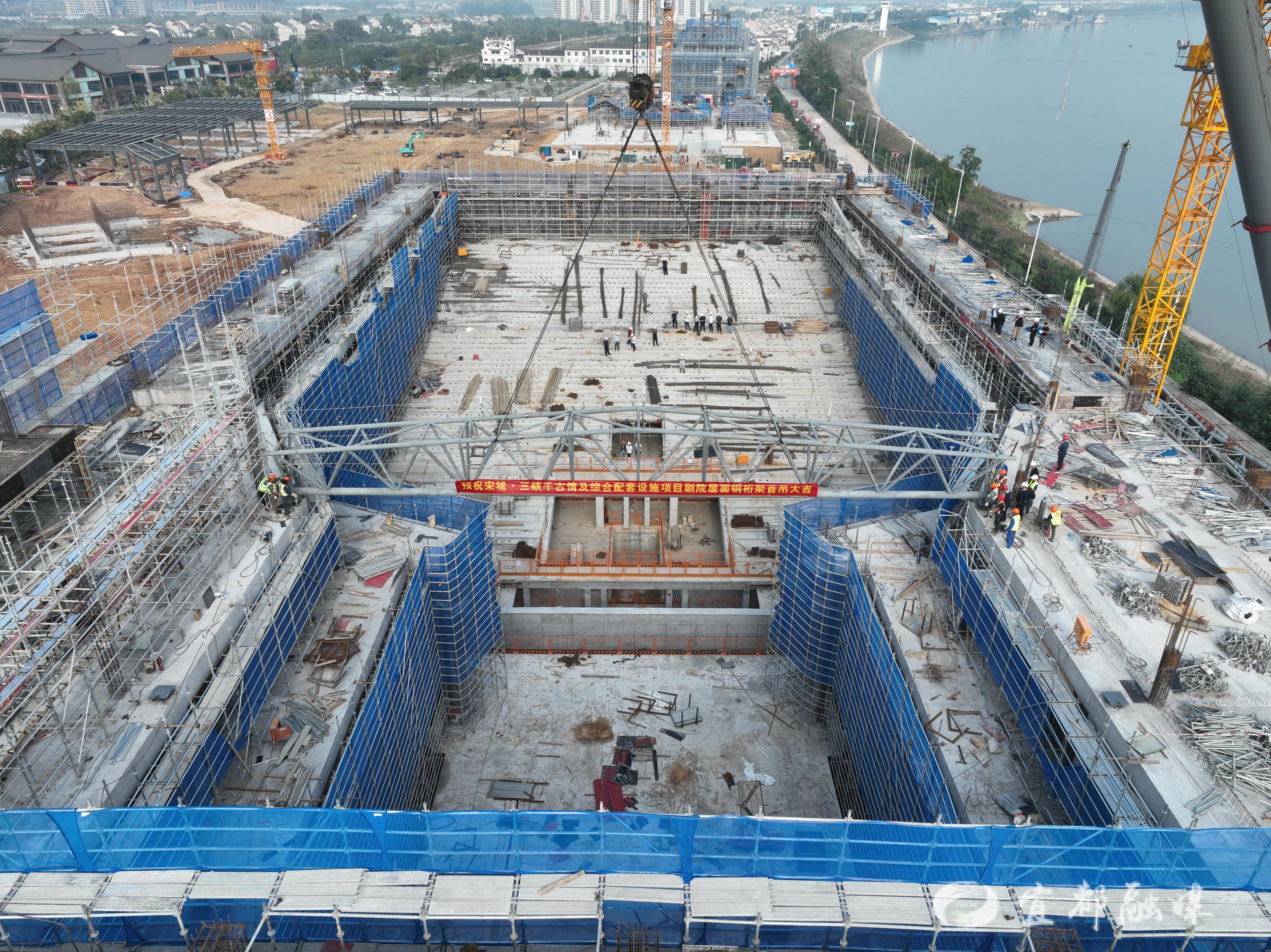 剧院是整个项目的控制性工程,施工难度极大,其中斜板大体积砼,同层空间梁板结构标高高低起伏,必须确保屋面混凝土结构达到设计强度后才可开始吊装。为确保吊装的安全性和精确性,施工单位根据专家论证建议,启用了宜昌市唯一一台700吨汽车起重机执行本次吊装工作。此次的吊装成功,标志着剧院的主体结构即将完成。