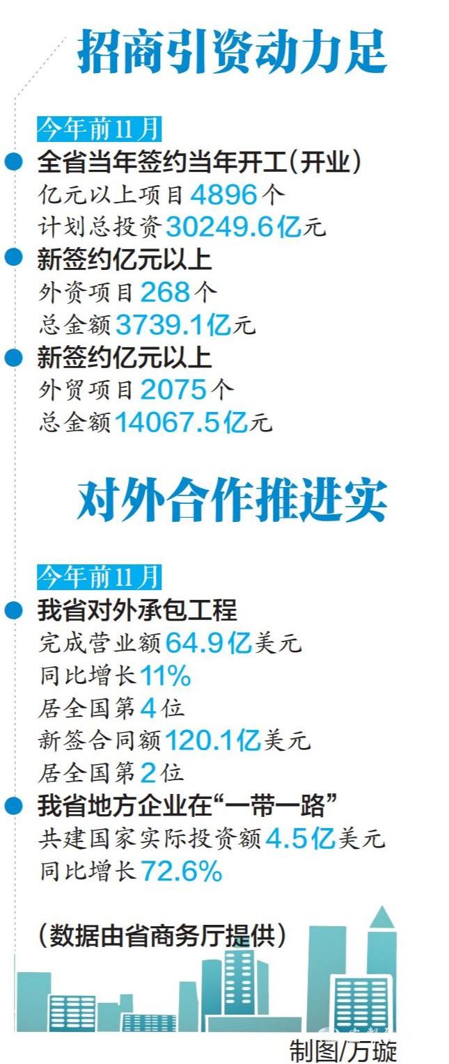 省商务厅提供数据显示,今年前11月,我省对外承包工程完成营业额64.9亿美元,同比增长11%,居全国第4位;新签合同额120.1亿美元,居全国第2位;我省地方企业在“一带一路”共建国家实际投资额4.5亿美元,同比增长72.6%。