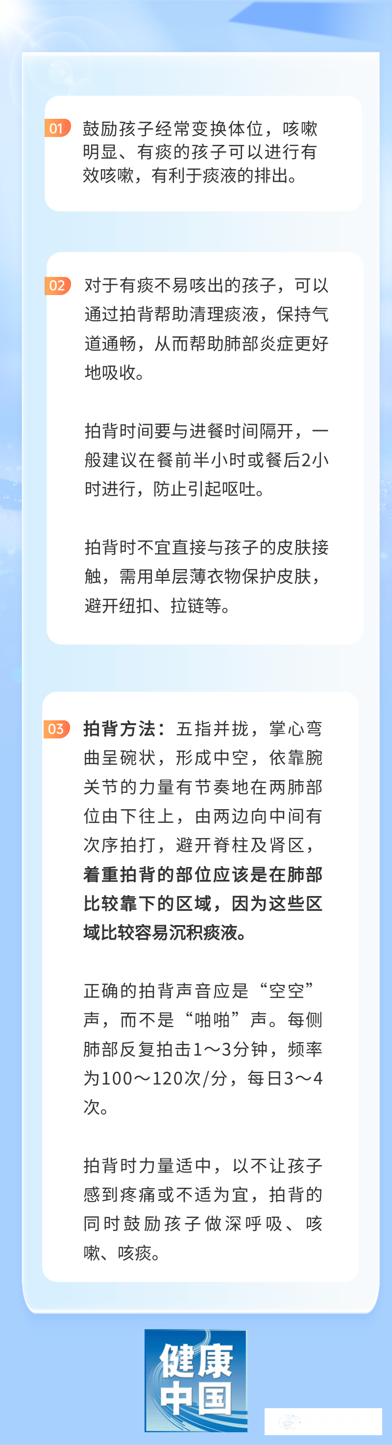 咳嗽是儿童呼吸系统疾病常见症状和就诊原因之一。 咳嗽是一种症状而不是疾病,是孩子生病时的“报警信号”。由于儿童咳嗽反射较弱,痰液容易在气道内潴留引起气道阻塞,这时通过拍背排痰,可以促进痰液排出,保持呼吸道通畅。 家长可给予以下护理措施: