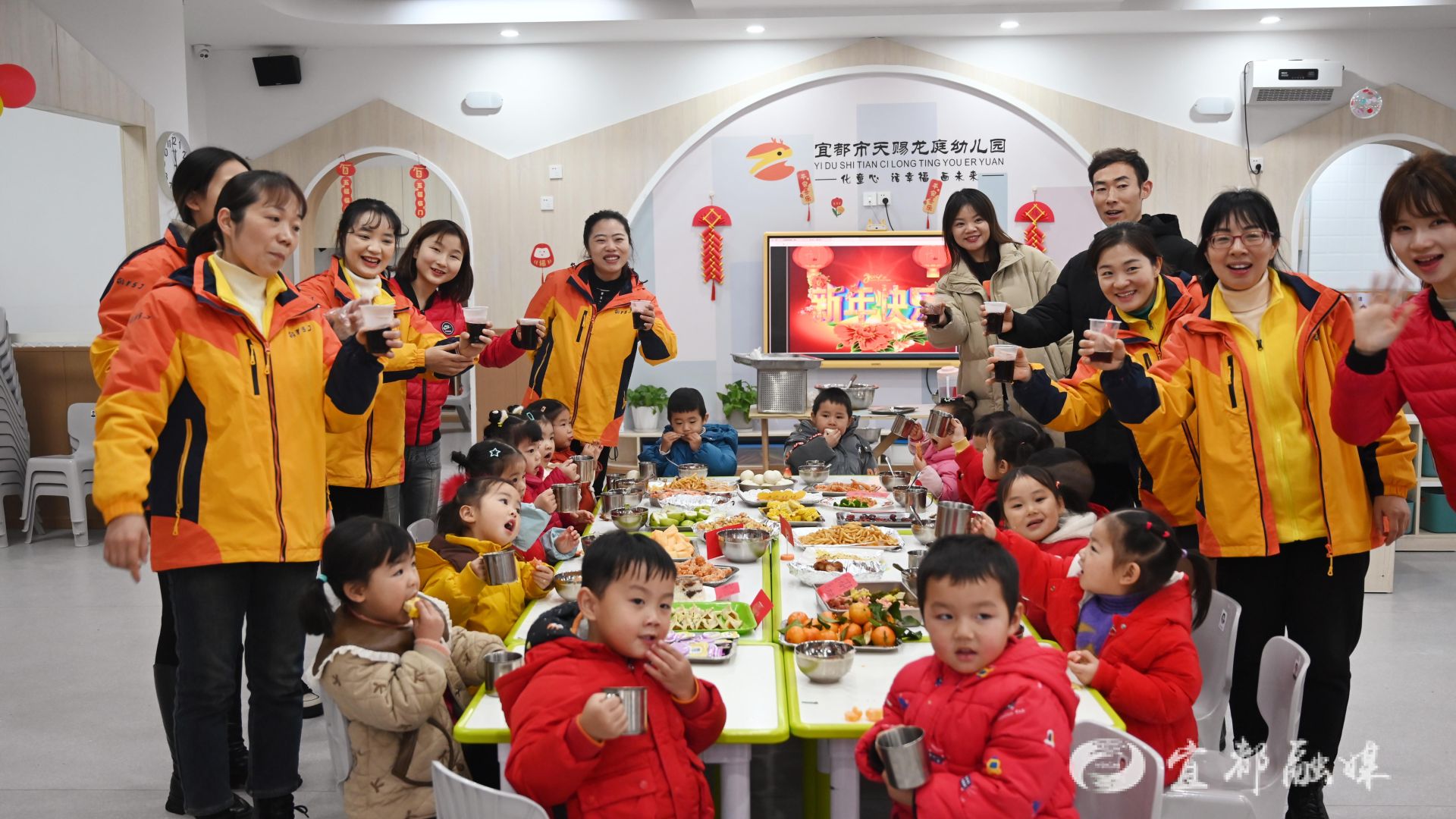 宜都融媒讯(通讯员 吴城城)12月29日上午,天赐龙庭幼儿园以“趣味集福 喜乐团年”为主题开展了庆元旦活动。通过写福字、舞蹈表演、制作团年宴的形式让幼儿参与新年活动,感受年文化。