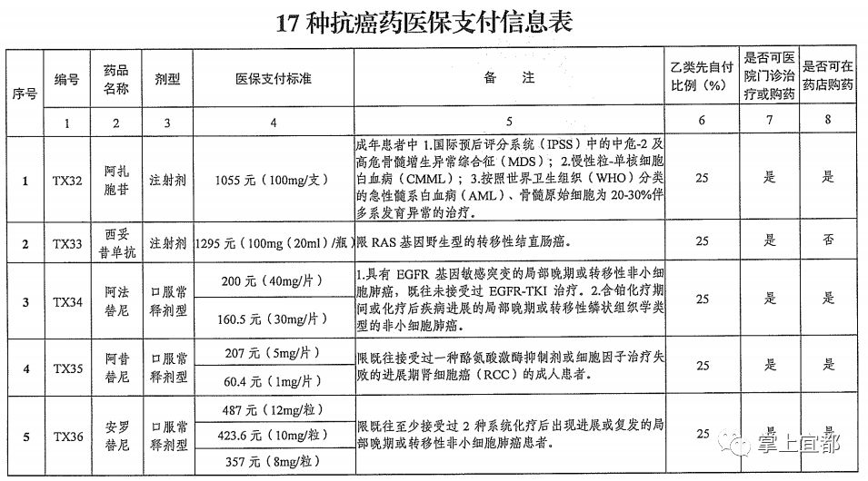 根据规定,全市从2018年11月30日起正式执行国家医疗保障局发布的《关于将17种抗癌药纳入国家基本医疗保险、工伤保险和生育保险药品目录乙类范围的通知》。该通知明确将阿扎胞苷等17种药品纳入《国家基本医疗保险、工伤保险和生育保险药品目录(2017年版)》乙类范围,并确定了医保支付标准。本次纳入药品目录的17种药品中,包括12个实体肿瘤药和5个血液肿瘤药,均为临床必需、疗效确切、参保人员需求迫切的肿瘤治疗药品,涉及非小细胞肺癌、肾癌、结直肠癌、黑色素瘤、淋巴瘤等多个癌种。