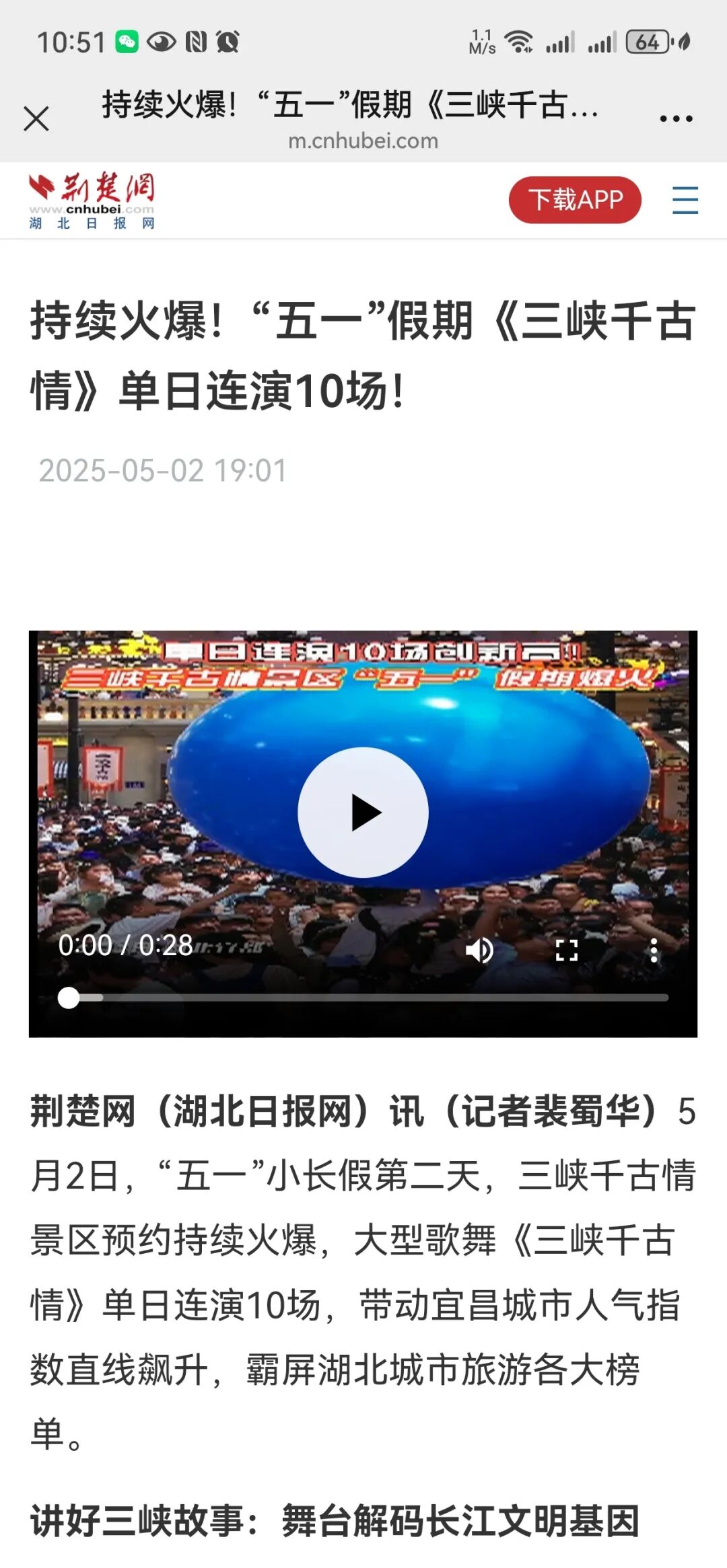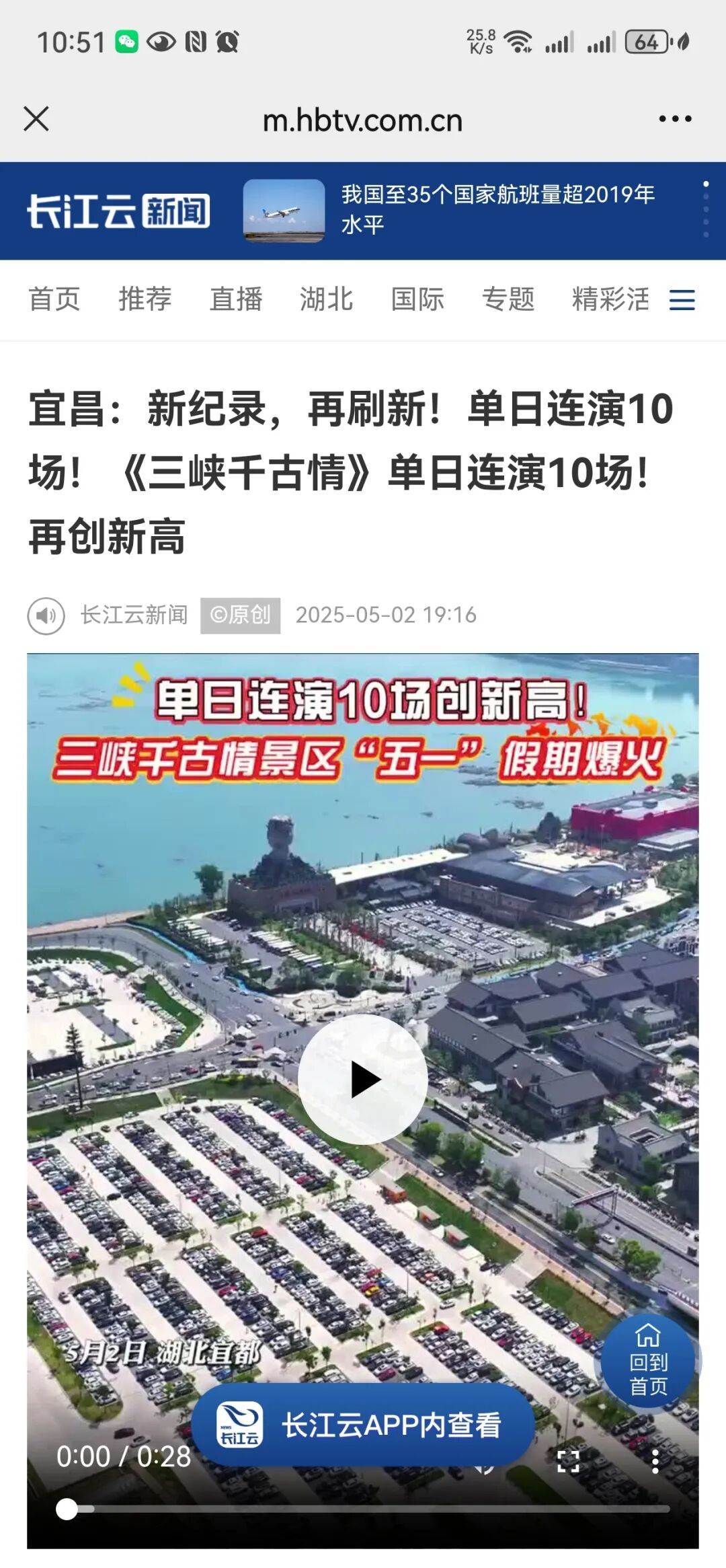 湖北日报、荆楚网、三峡日报、长江云新闻等媒体持续报道三峡千古情单日最高演出10场次,突破历史单日演出场次纪录,宜都火爆文旅市场;