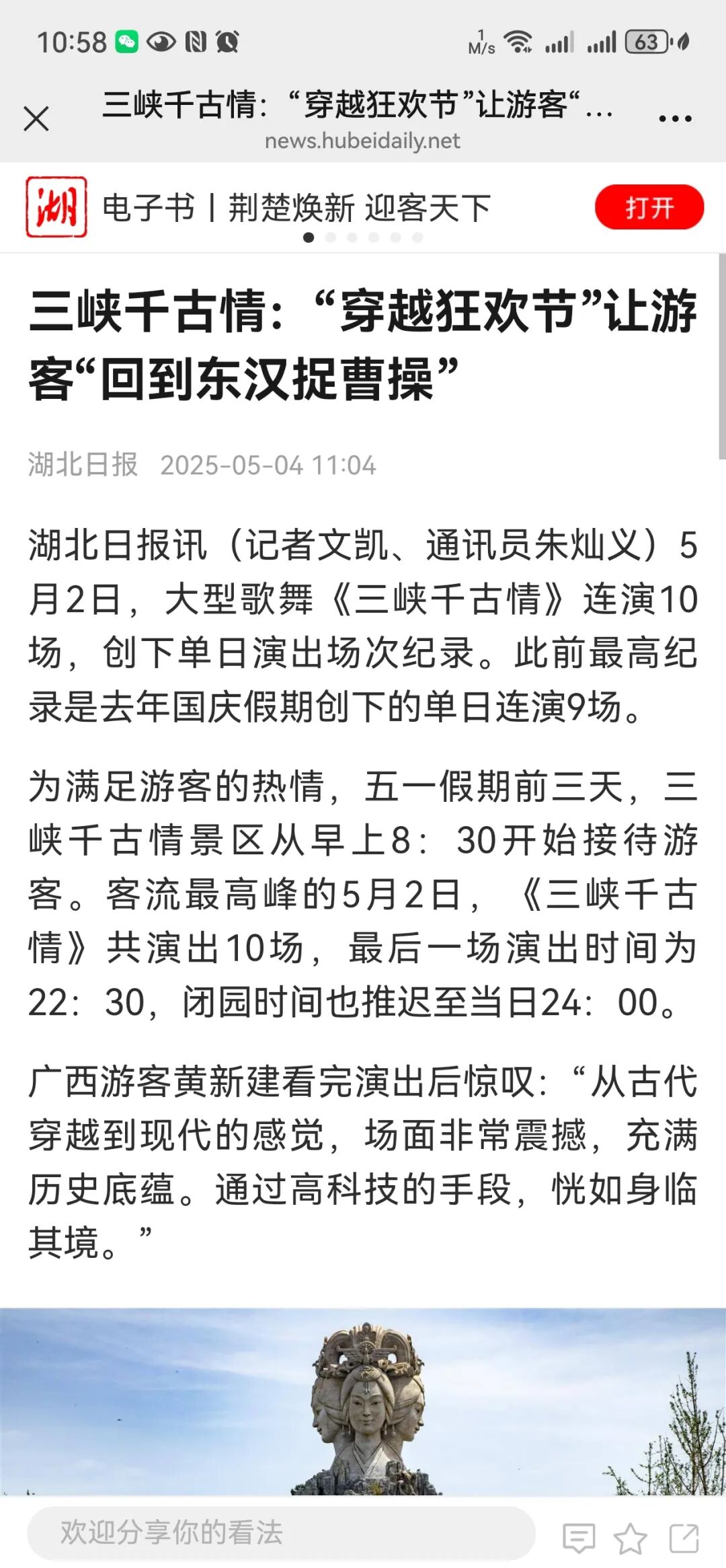三峡千古情景区推出“穿越狂欢节”活动,万名游客在三国副本中体验国风换装、实景穿越、沉浸剧情,单日最高演出10场次;