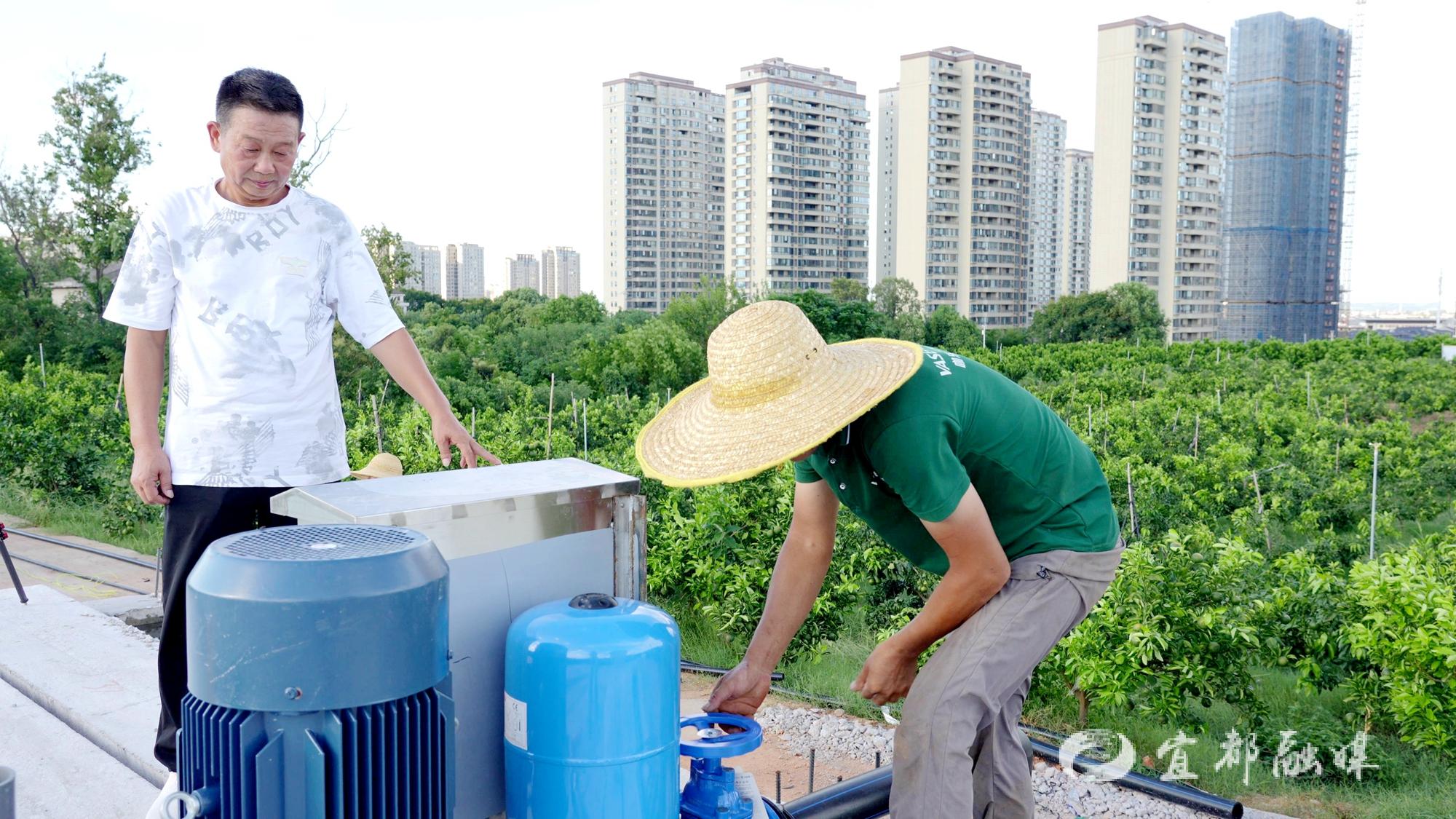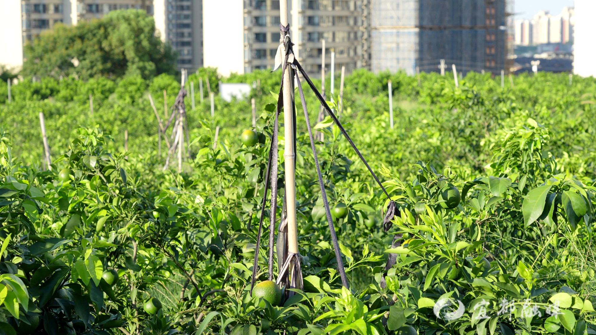 姚家店村楠竹园桔子生态农场负责人廖忠国介绍:“目前果子进入了关键的膨大期,前段时间我们组织工人进行了吊枝。这几天温度特别高,我们定期进行喷灌,(同时农场内)进行生草栽培,保湿、保墒、抗旱。”