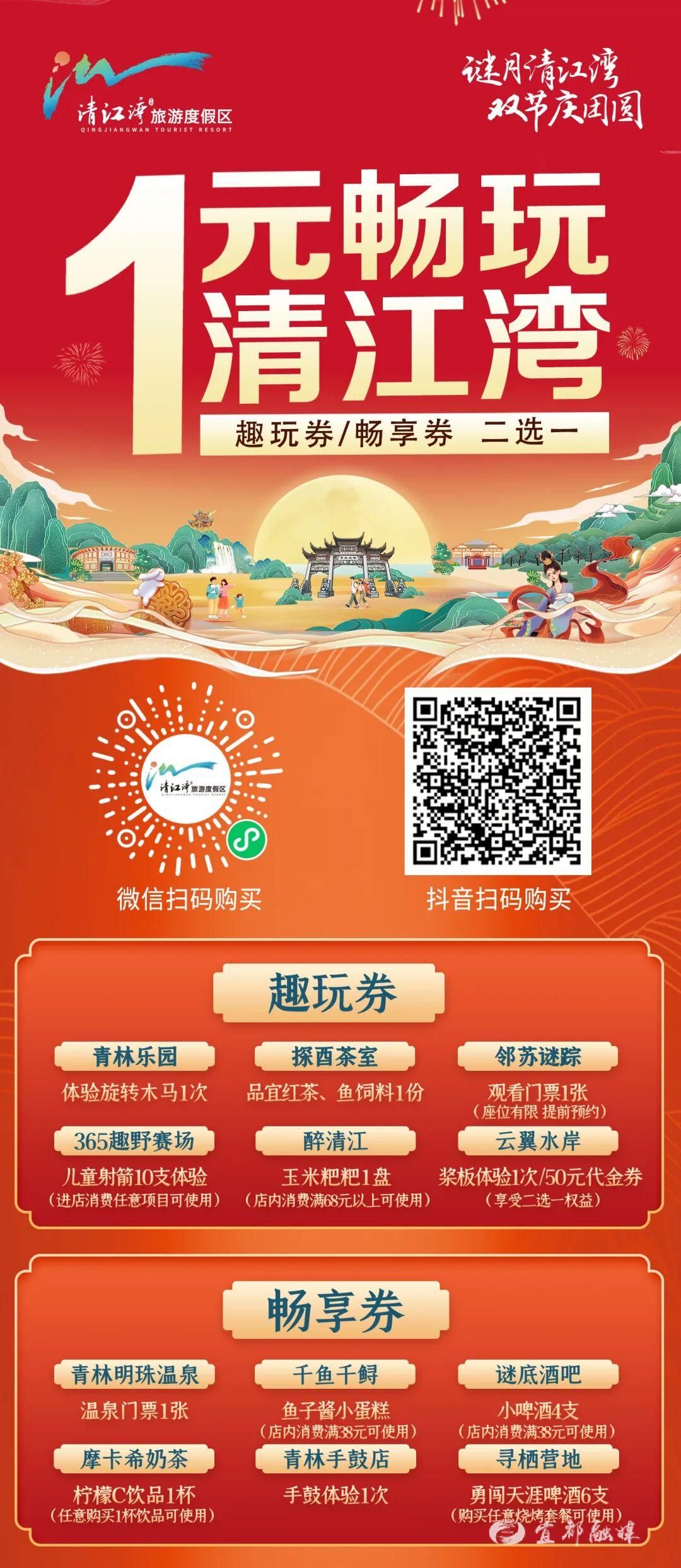 在“宜都市清江湾旅游度假区”微信小程序、抖音官方号抢购,及 “清江湾·青林乐园”“清江湾·云翼水岸” 抖音官号直播间抢购。有效期为2025年10月1日-6日逾期自动失效。