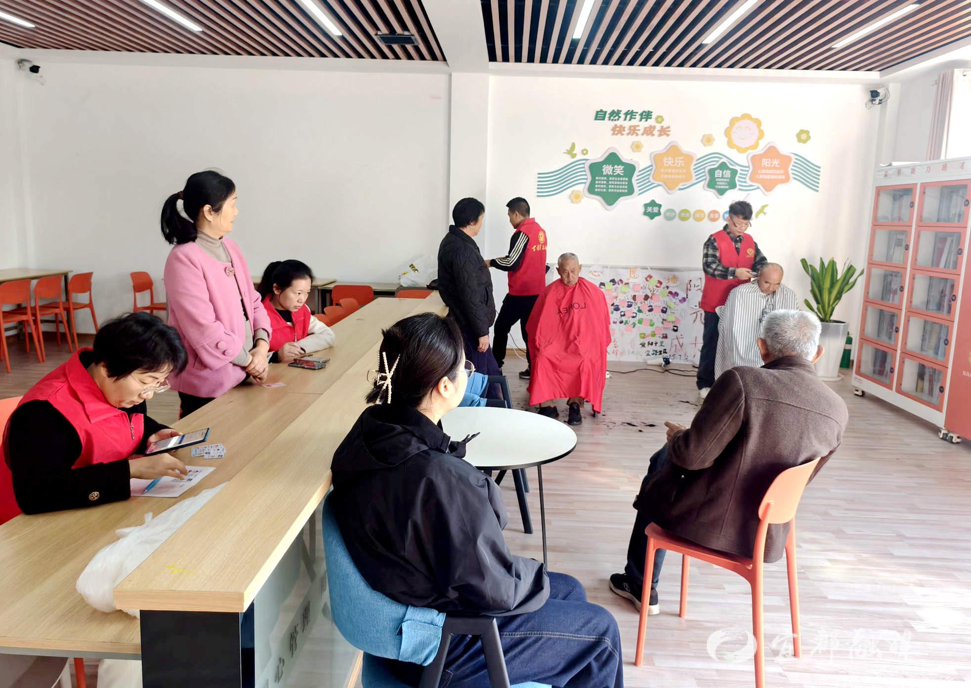 当日微风和煦,得知活动消息的老人们早早排起长队,欢声笑语中透着期待。活动现场划分义剪区与医保参保区,两项服务同步推进、高效暖心。在义剪区,村党员志愿者肖欢欢、张冲两位“理发师”一边手持剪刀为老人精心修剪发型,一边与老人拉家常:“婆婆,您这发型剪短点显精神”“爷爷,您看看这个长度合心意不?”清脆的“咔嚓”声里,发丝落下,不过十分钟,老人们便换上干练发型,精神面貌焕然一新,脸上满是满意笑容。