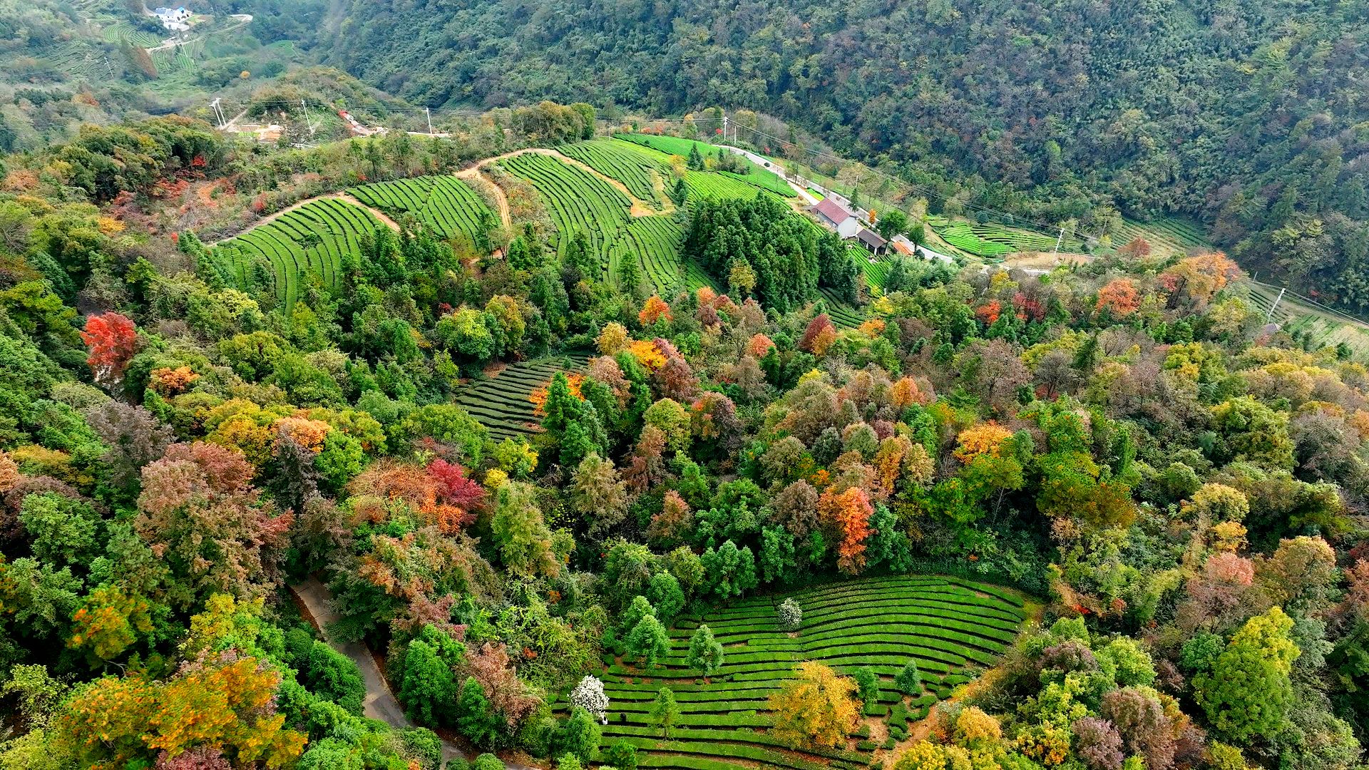 远山近岭间的山林早已褪去葱郁,换上红、黄、橙交织的盛装,层林尽染的景致如诗如画。澄澈湖水静静流淌,将斑斓山林与明净天空纳入怀中,宛如一块流动的彩色宝石,与山林相映成趣。金黄的银杏叶缀满枝头,在阳光照耀下闪烁着温暖光泽,微风拂过,叶片簌簌飘落,铺就出一地柔软的“金毯”。