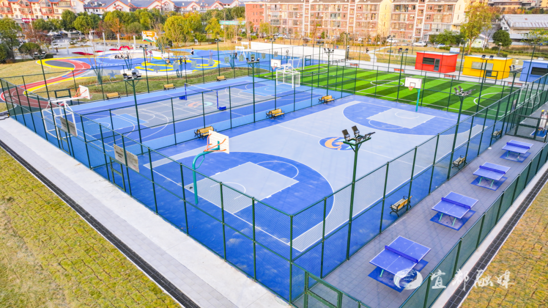 运动场以“笼式安全设计+多功能适配”为核心,规划五大运动空间:五人制笼式足球场、笼式多功能球场、笼式篮球场、乒乓球场及综合健身区,满足青少年竞技、中老年康养、全民日常锻炼等多元需求。场地旁配套3座集装箱式服务用房及小卖部,兼顾储物、补给等实用功能,沿场地边缘错落布置休憩坐凳,为运动间隙提供舒适停留空间,实现运动与休憩的无缝衔接。