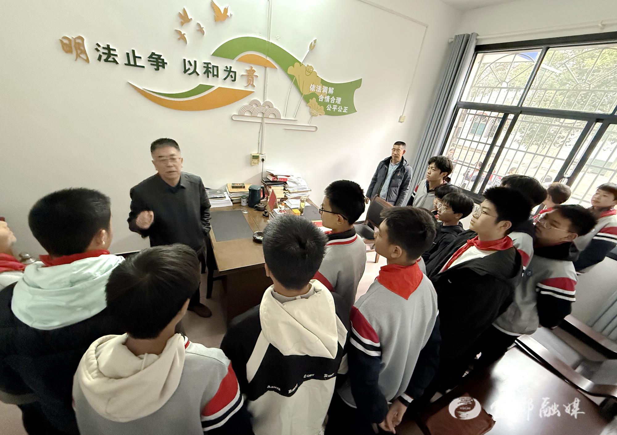 活动中,同学们先后参观了法庭审判庭、调解室及司法所法治教育展厅。在审判庭,法官用通俗生动的语言讲解法徽、法槌的象征意义,细致介绍庭审基本流程。随后,学生分组参与“模拟法庭”角色扮演,分别化身法官、原告、被告等角色,完整演绎庭审环节,在沉浸式体验中直观感受法律的权威与神圣。