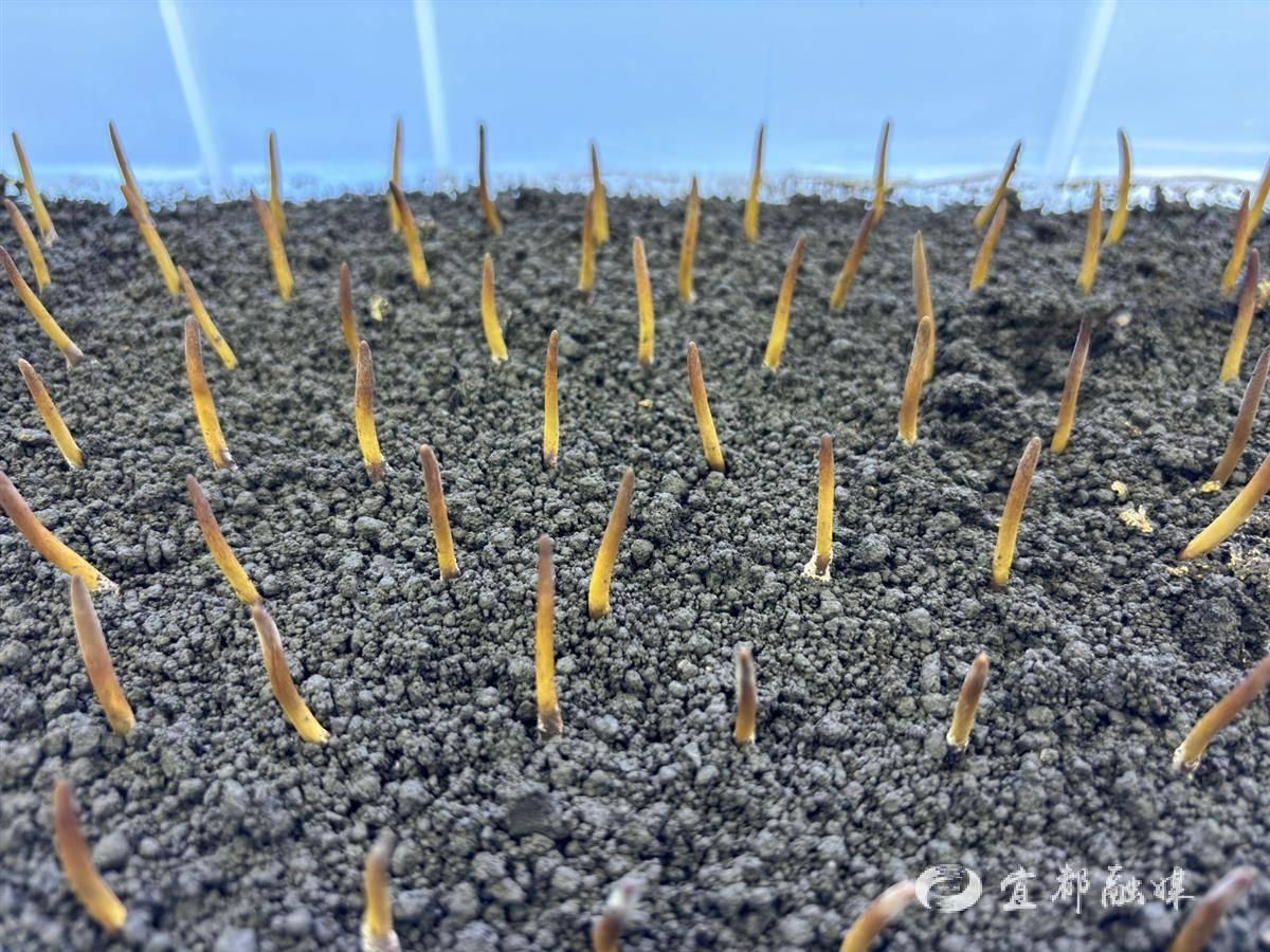 稳定模拟的高原环境下,冬虫夏草破土而出。(湖北日报全媒记者 文凯 摄)