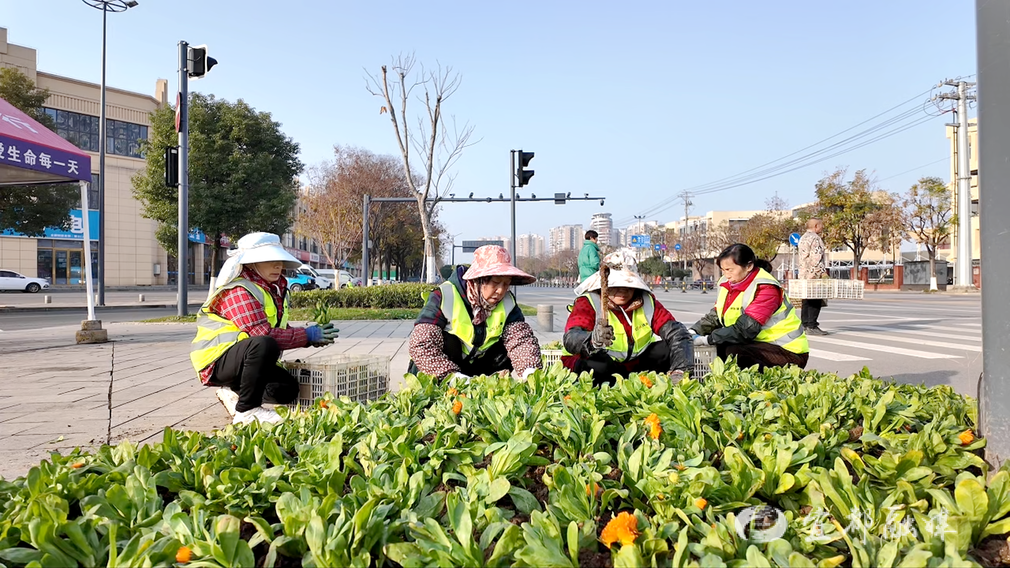 在陆城城河大道与杨守敬大道交叉口,园林工人正利用交通平峰时段有序作业,卸下一批批花苗,松土、定位、摆放,种下金盏菊、三色堇、石竹等耐寒品种,依照规划形成富有层次感的色彩组合与图案布局。