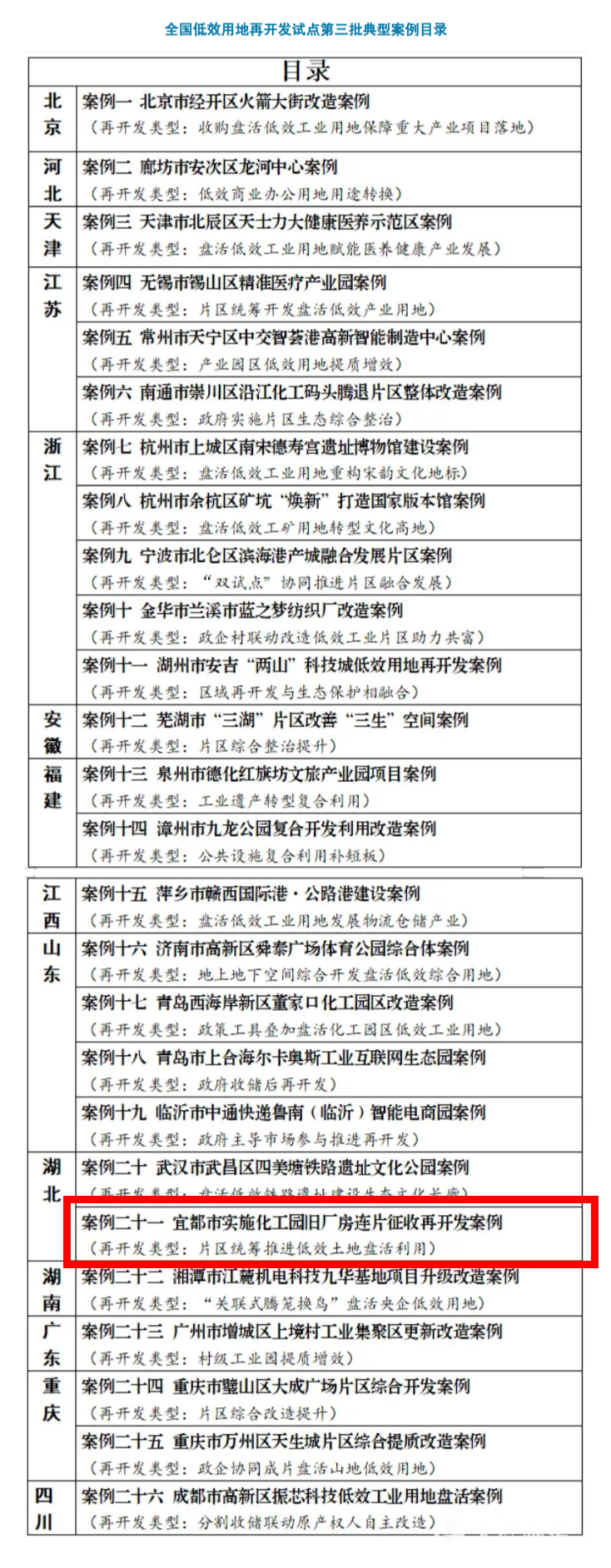 宜都融媒讯(通讯员 许璞、李周荣)近日,自然资源部发布低效用地再开发试点第三批典型案例名单,宜都市“实施化工园旧厂房连片征收再开发”案例成功入选,成为宜昌市唯一获此殊荣的案例,被纳入全国推广范围。
