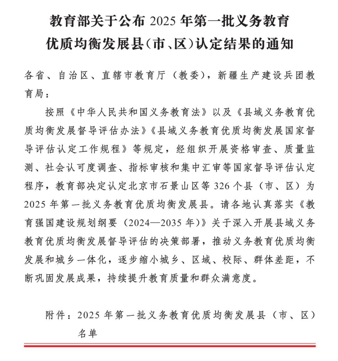 宜都融媒讯(通讯员 周娇)近日,教育部公布了2025年第一批义务教育优质均衡发展县(市、区)名单,宜都市榜上有名,这是继创成全国学前教育普及普惠县(市、区)之后的又一国字号荣誉,全省仅4个县(市、区)同时通过这“两项评估”。这不仅是对宜都教育发展成果的充分肯定,更标志着该市教育事业已跨入优质均衡、全域提质的全新发展阶段。