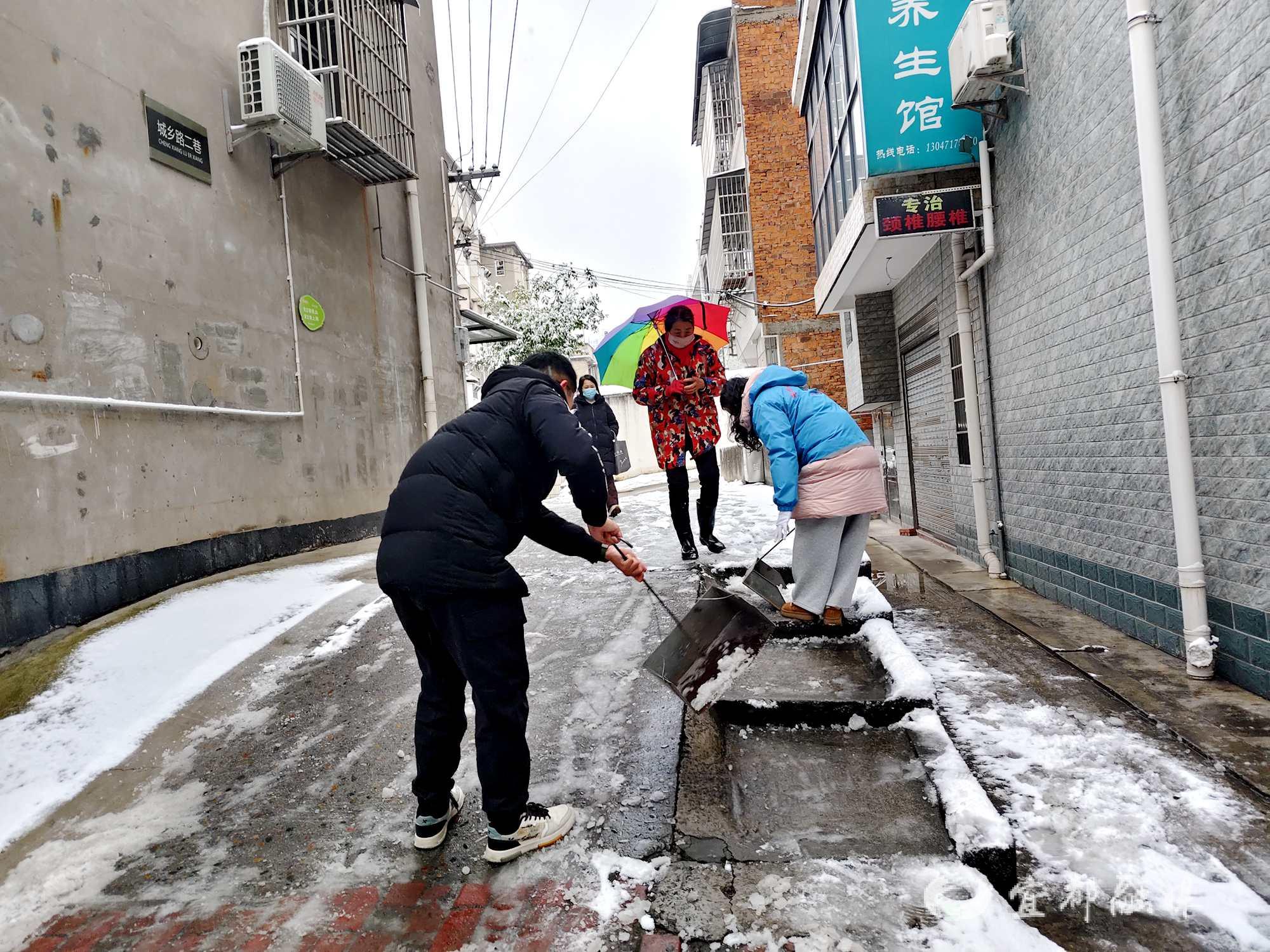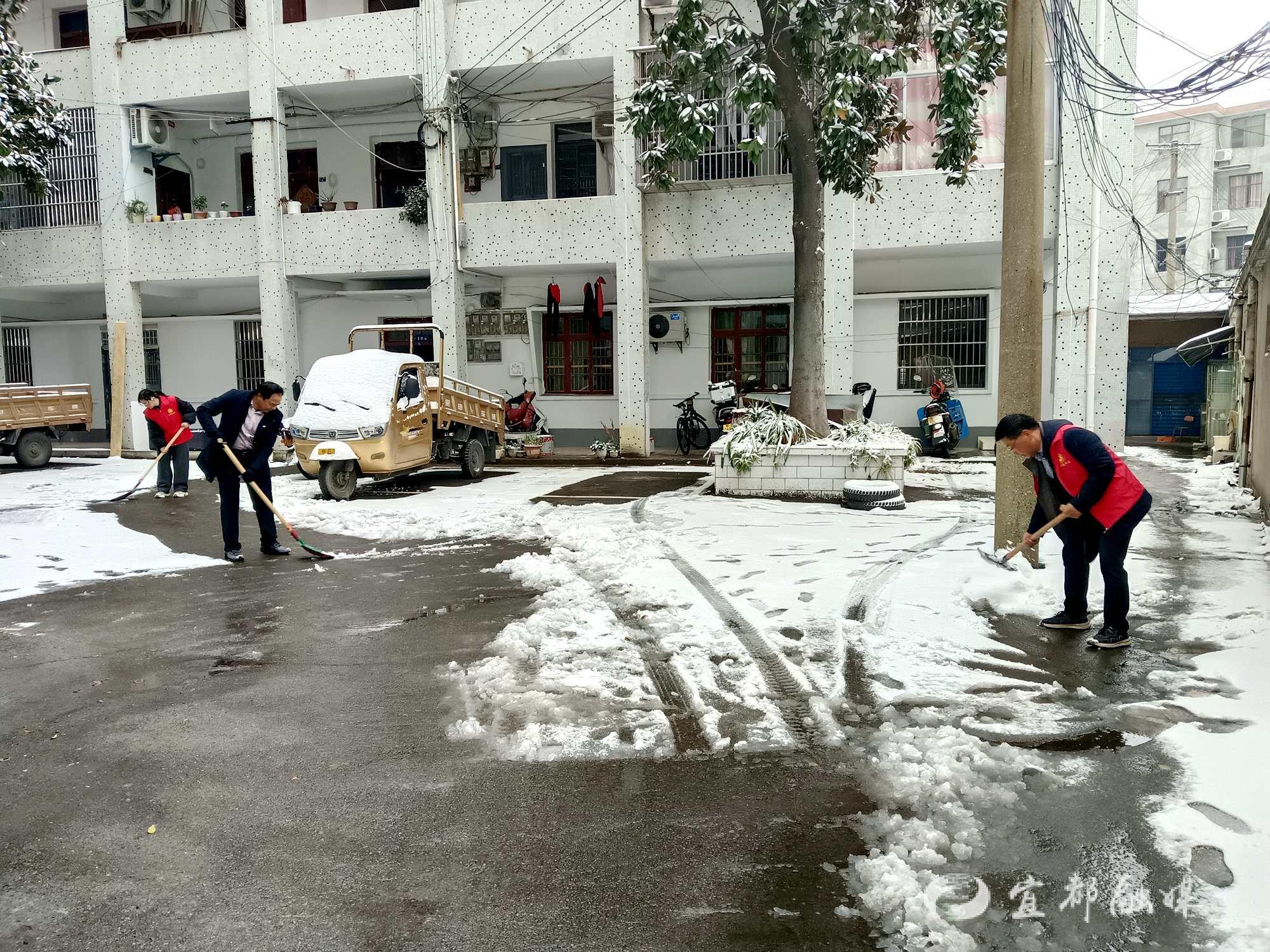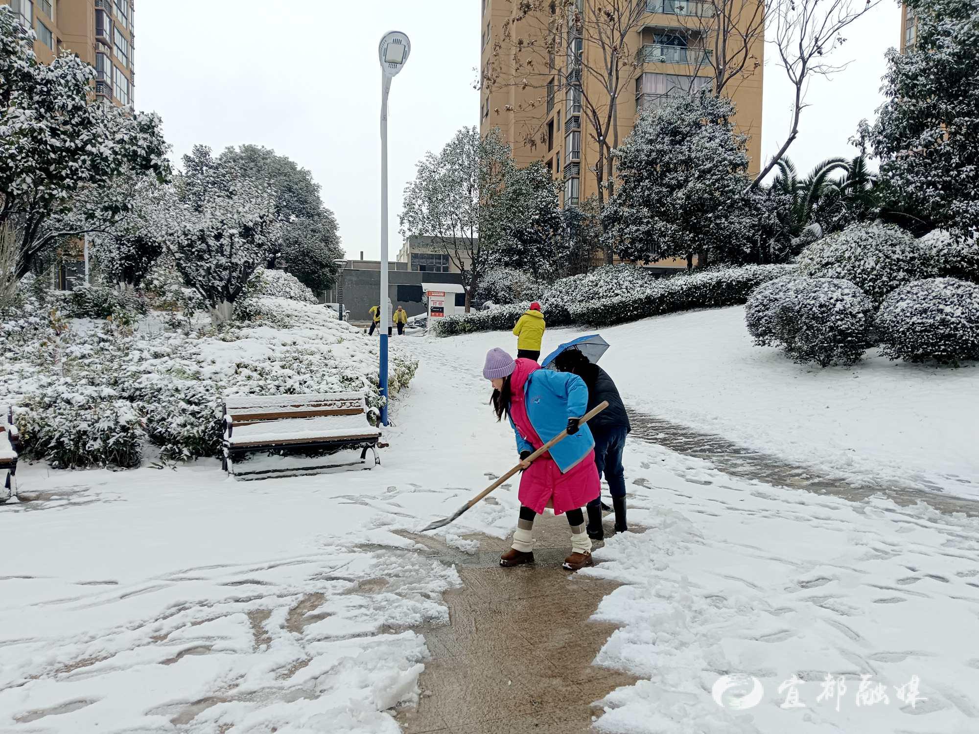 宜都融媒讯(通讯员 肖懿娜)1月20日,宜都普降大雪,银装素裹的同时,道路湿滑给居民出行带来极大安全隐患。陆城街道清江社区迅速启动应急预案,80余名党员干部、网格员及志愿者闻令而动,迎着寒风、踏着积雪,全面打响“保畅通、护平安”攻坚战。