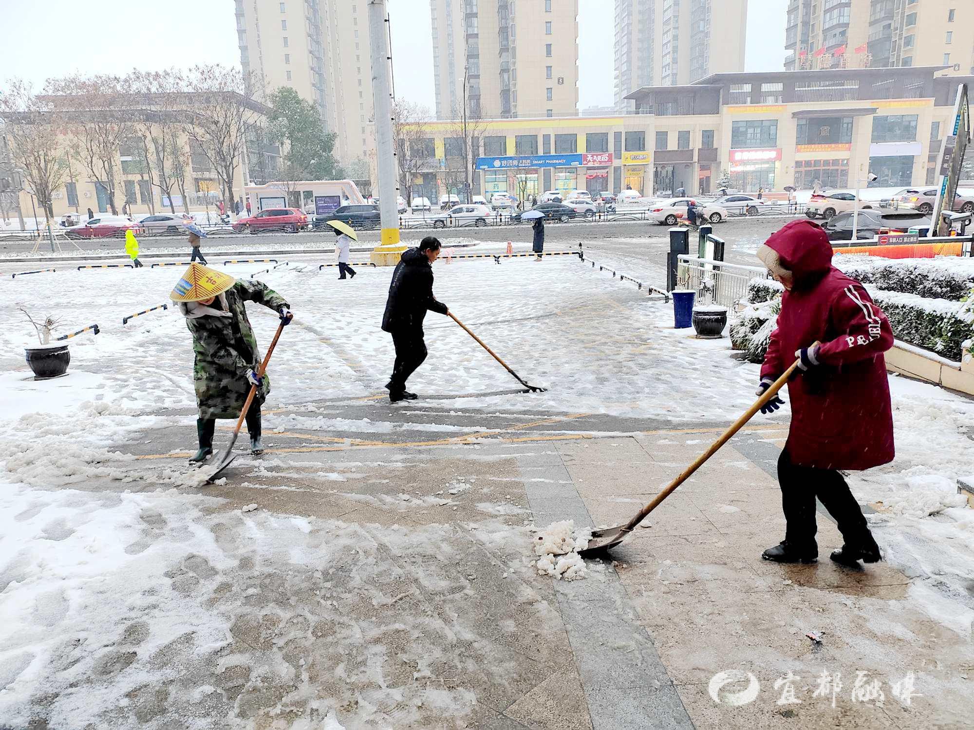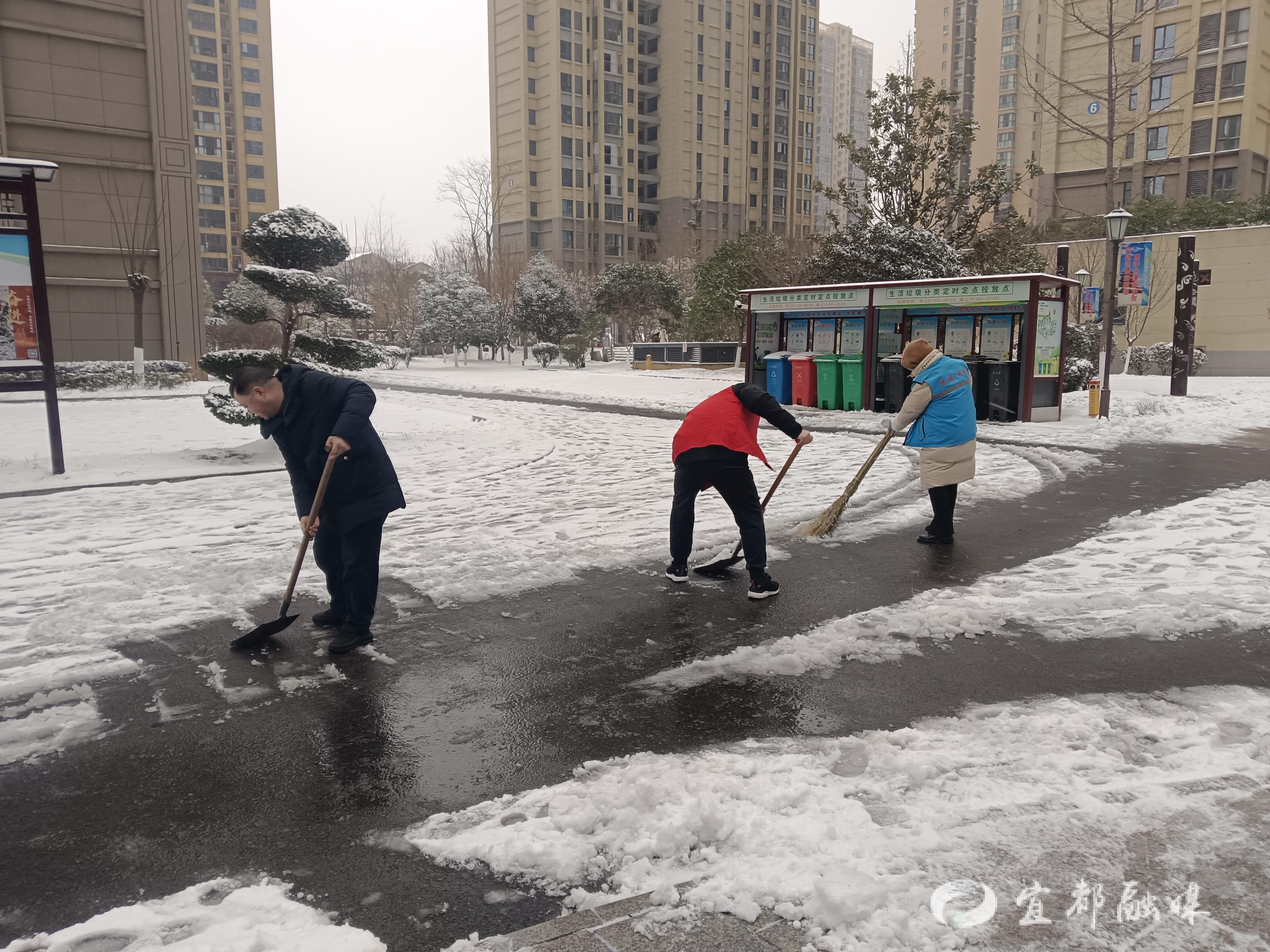 宜都融媒讯(通讯员 鄢静雅)1月19日晚,一场大雪如约而至。面对这场“冰雪考验”,陆城街道锦江社区工作者、各物业公司、业主委员会闻雪而动,在寒风中谱写了一曲热气腾腾的“扫雪除冰进行曲”。