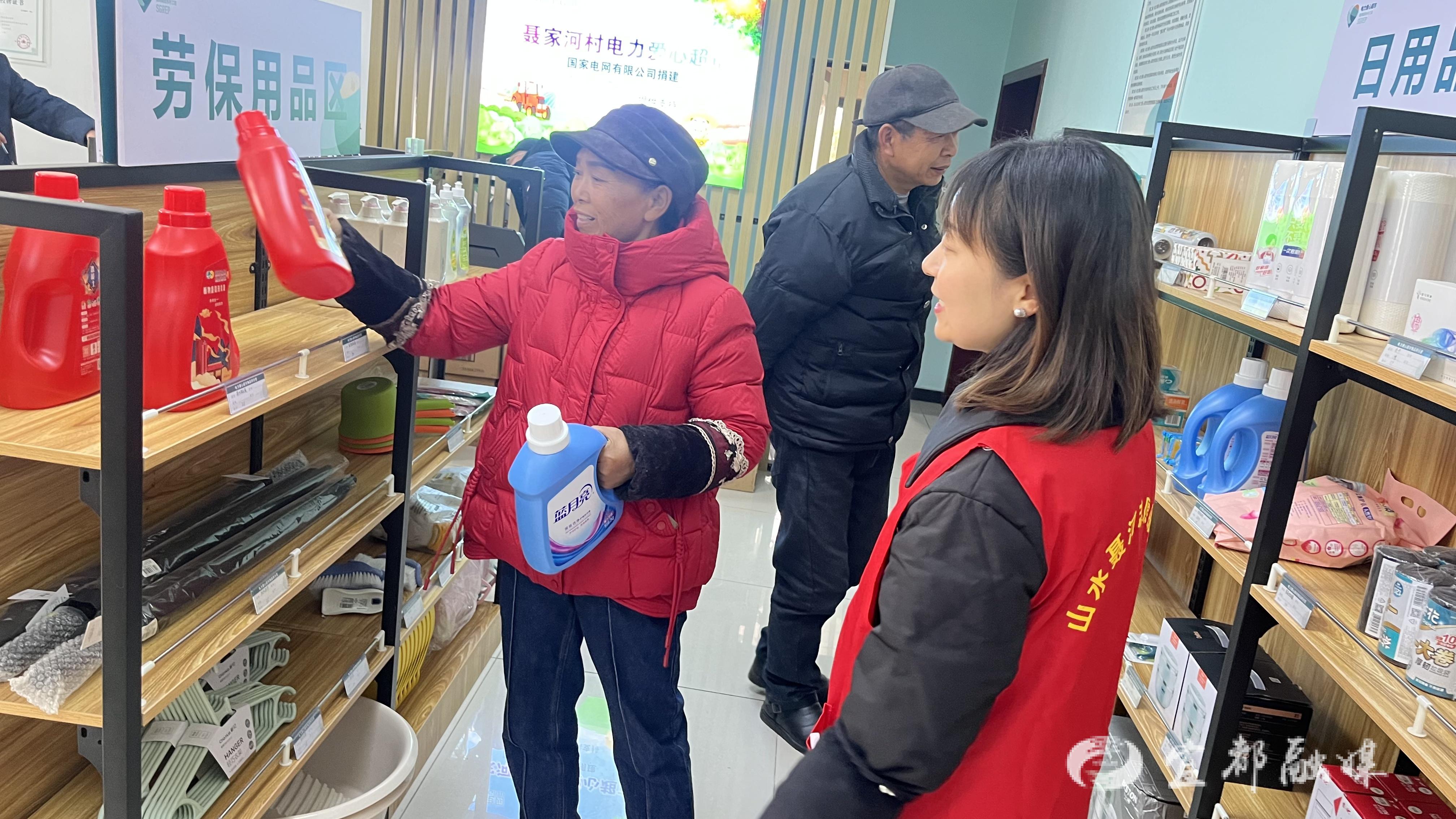 货架上,米面粮油、家用电器、日用百货琳琅满目。村民们手持“积分存折”,兴致勃勃地挑选、兑换,笑声不断。