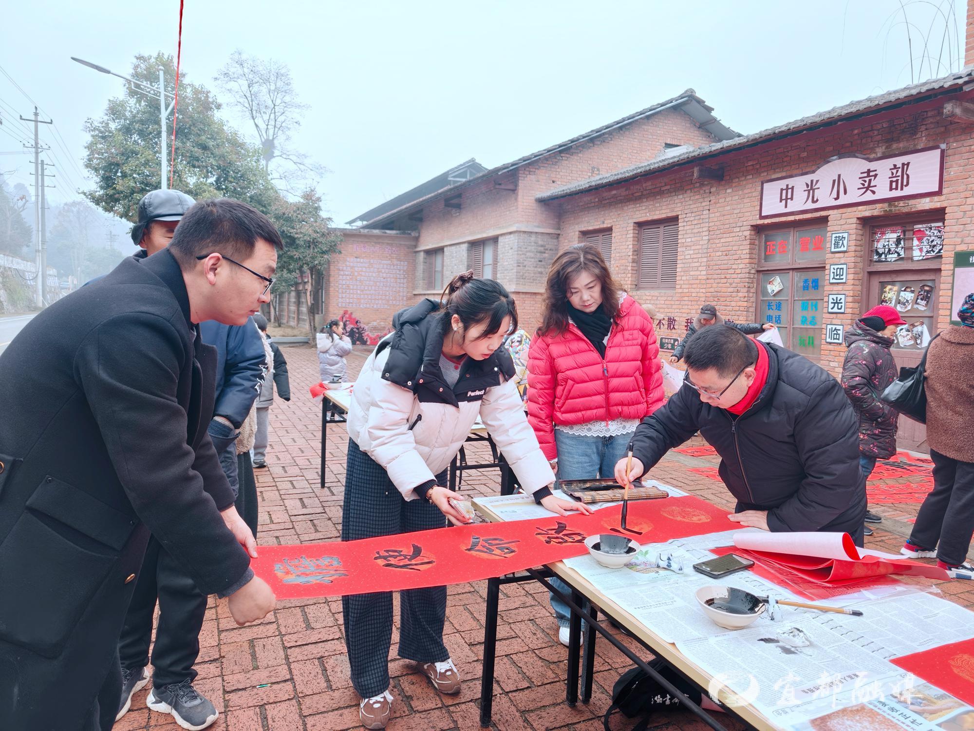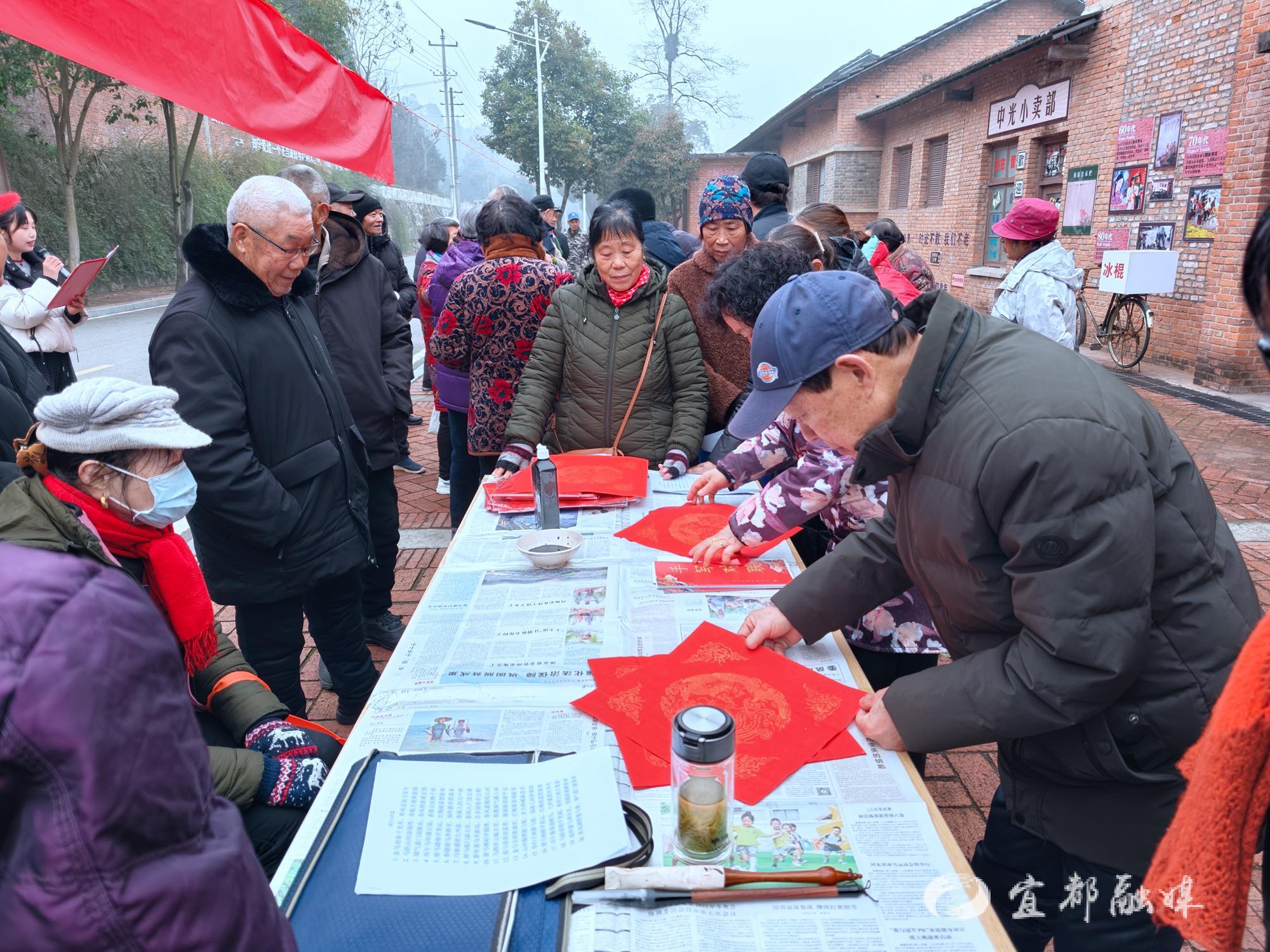 宜都融媒讯(通讯员 曾青娅)1月28日上午,宜都市老年大学组织书画班师生走进高坝洲镇中光社区,在承载三线记忆的文化墙前开展“迎新春送福”活动,现场为居民书写、赠送春联和“福”字,以笔墨传情,传递新春祝福。